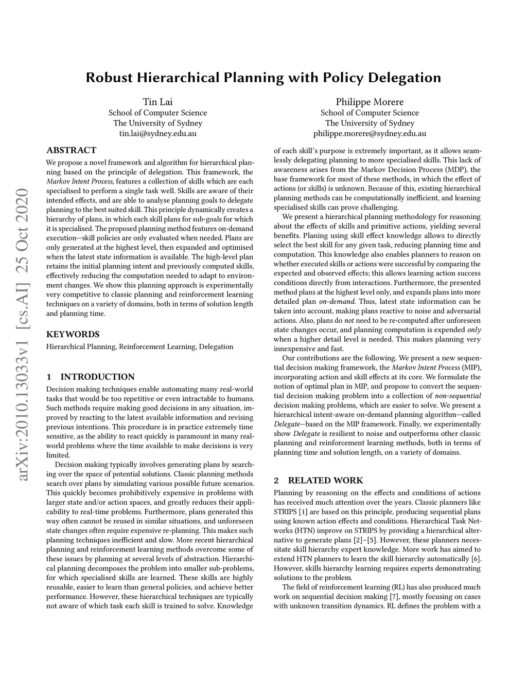 We propose a novel framework and algorithm for hierarchical planning based on the principle of delegation. This framework, the Markov Intent Process, features a collection of skills which are each specialised to perform a single task well. Skills are aware of their intended effects and are able to analyse planning goals to delegate planning to the best-suited skill. This principle dynamically creates a hierarchy of plans, in which each skill plans for sub-goals for which it is specialised. The proposed planning method features on-demand execution---skill policies are only evaluated when needed. Plans are only generated at the highest level, then expanded and optimised when the latest state information is available. The high-level plan retains the initial planning intent and previously computed skills, effectively reducing the computation needed to adapt to environmental changes. We show this planning approach is experimentally very competitive to classic planning and reinforcement learning techniques on a variety of domains, both in terms of solution length and planning time.