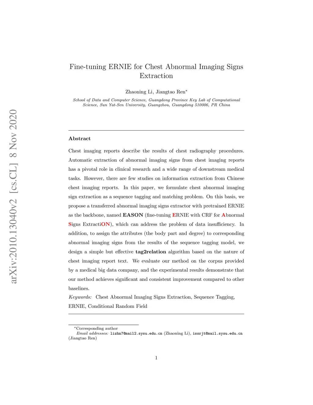 Fine-tuning ERNIE for chest abnormal imaging signs extraction