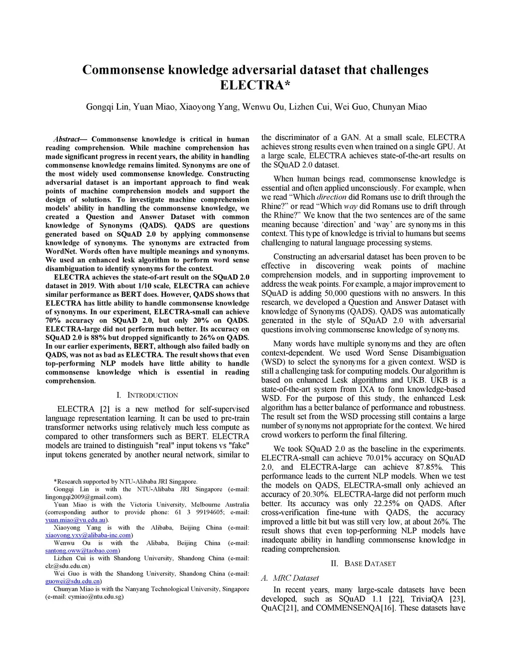 Commonsense knowledge adversarial dataset that challenges ELECTRA