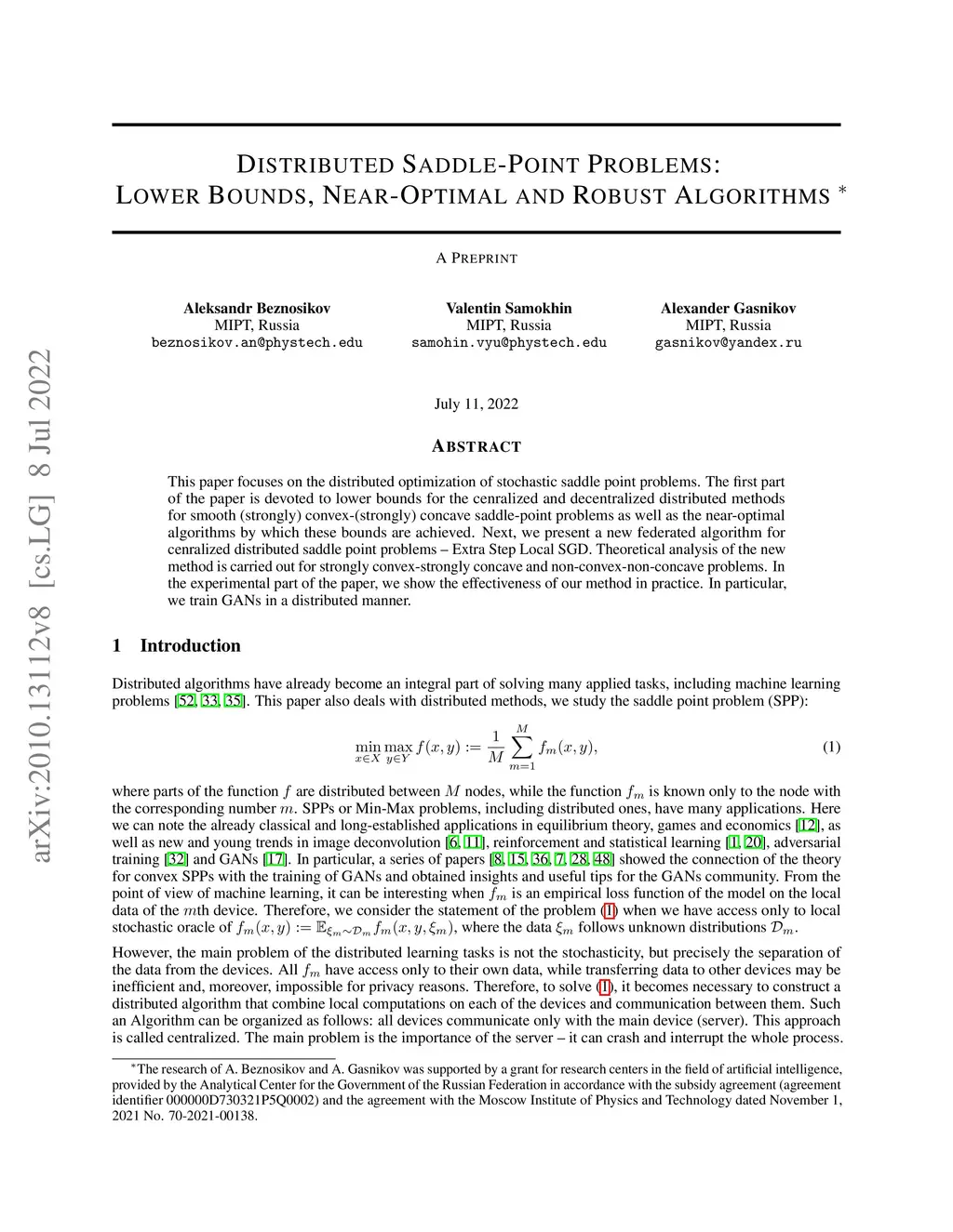 This paper focuses on the distributed optimization of stochastic saddle point problems. The first part of the paper is devoted to lower bounds for the cenralized and decentralized distributed methods for smooth (strongly) convex-(strongly) concave saddle-point problems as well as the near-optimal algorithms by which these bounds are achieved. Next, we present a new federated algorithm for cenralized distributed saddle point problems - Extra Step Local SGD. Theoretical analysis of the new method is carried out for strongly convex-strongly concave and non-convex-non-concave problems. In the experimental part of the paper, we show the effectiveness of our method in practice. In particular, we train GANs in a distributed manner.