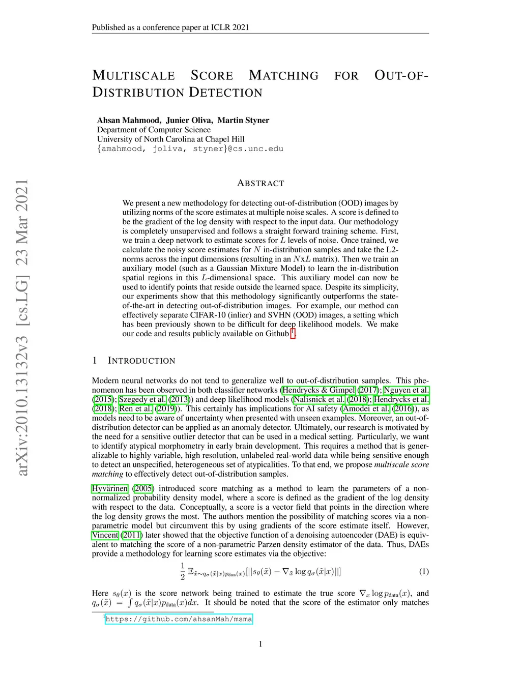 We present a new methodology for detecting out-of-distribution (OOD) images by utilizing norms of the score estimates at multiple noise scales. A score is defined to be the gradient of the log density with respect to the input data. Our methodology is completely unsupervised and follows a straight forward training scheme. First, we train a deep network to estimate scores for levels of noise. Once trained, we calculate the noisy score estimates for N in-distribution samples and take the L2-norms across the input dimensions (resulting in an NxL matrix). Then we train an auxiliary model (such as a Gaussian Mixture Model) to learn the in-distribution spatial regions in this L-dimensional space. This auxiliary model can now be used to identify points that reside outside the learned space. Despite its simplicity, our experiments show that this methodology significantly outperforms the state-of-the-art in detecting out-of-distribution images. For example, our method can effectively separate CIFAR-10 (inlier) and SVHN (OOD) images, a setting which has been previously shown to be difficult for deep likelihood models.