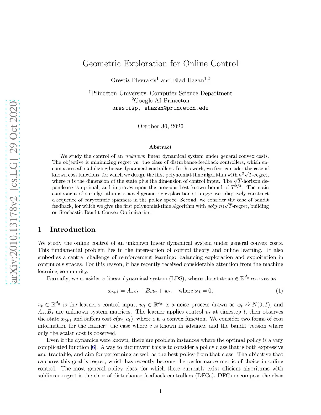 We study the control of an \emph{unknown} linear dynamical system under general convex costs. The objective is minimizing regret vs. the class of disturbance-feedback-controllers, which encompasses all stabilizing linear-dynamical-controllers. In this work, we first consider the case of known cost functions, for which we design the first polynomial-time algorithm with -regret, where is the dimension of the state plus the dimension of control input. The -horizon dependence is optimal, and improves upon the previous best known bound of . The main component of our algorithm is a novel geometric exploration strategy: we adaptively construct a sequence of barycentric spanners in the policy space. Second, we consider the case of bandit feedback, for which we give the first polynomial-time algorithm with -regret, building on Stochastic Bandit Convex Optimization.