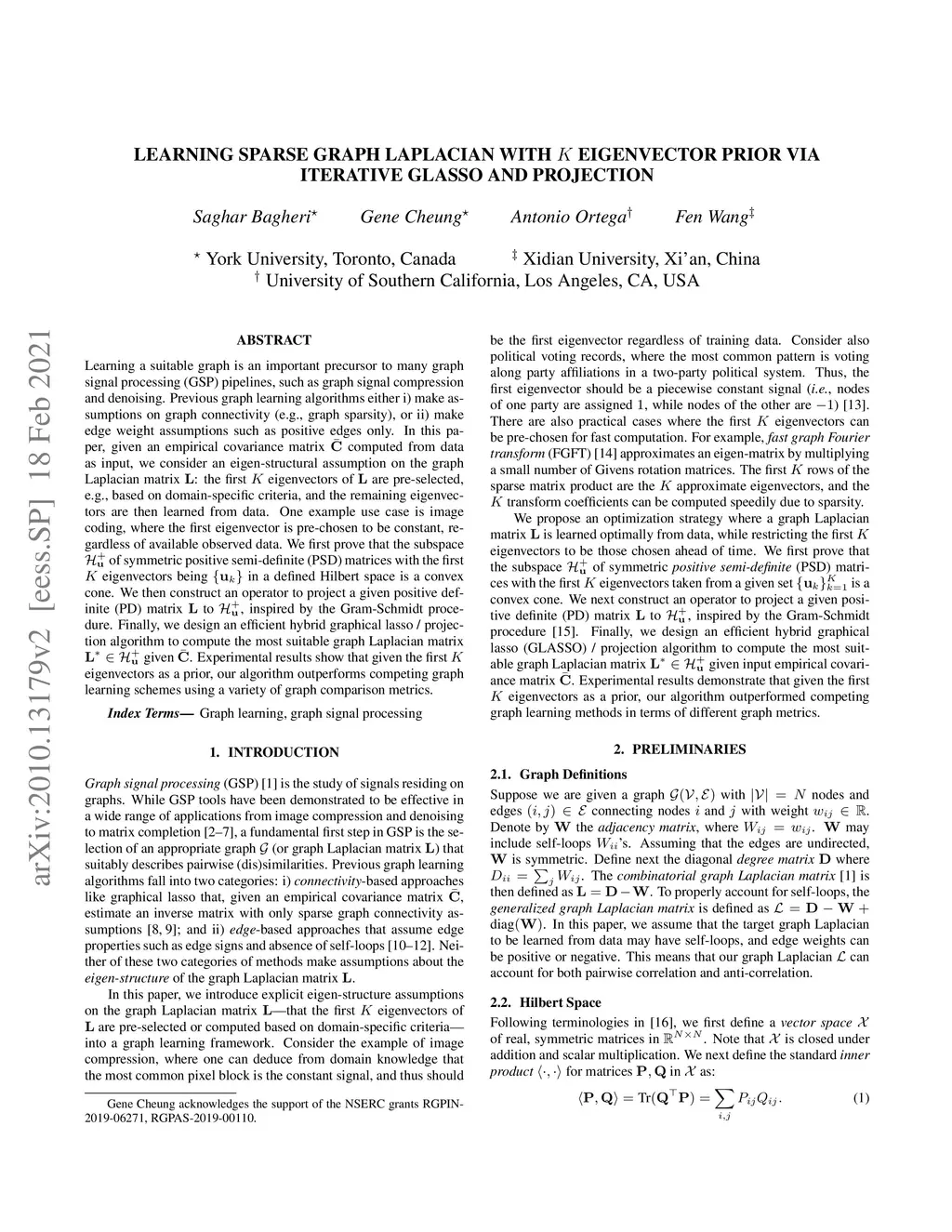 Learning a suitable graph is an important precursor to many graph signal processing (GSP) pipelines, such as graph spectral signal compression and denoising. Previous graph learning algorithms either i) make some assumptions on connectivity (e.g., graph sparsity), or ii) make simple graph edge assumptions such as positive edges only. In this paper, given an empirical covariance matrix computed from data as input, we consider a structural assumption on the graph Laplacian matrix : the first eigenvectors of are pre-selected, e.g., based on domain-specific criteria, such as computation requirement, and the remaining eigenvectors are then learned from data. One example use case is image coding, where the first eigenvector is pre-chosen to be constant, regardless of available observed data. We first prove that the subspace of symmetric positive semi-definite (PSD) matrices with the first eigenvectors being in a defined Hilbert space is a convex cone. We then construct an operator to project a given positive definite (PD) matrix to , inspired by the Gram-Schmidt procedure. Finally, we design an efficient hybrid graphical lasso/projection algorithm to compute the most suitable graph Laplacian matrix given . Experimental results show that given the first eigenvectors as a prior, our algorithm outperforms competing graph learning schemes using a variety of graph comparison metrics.