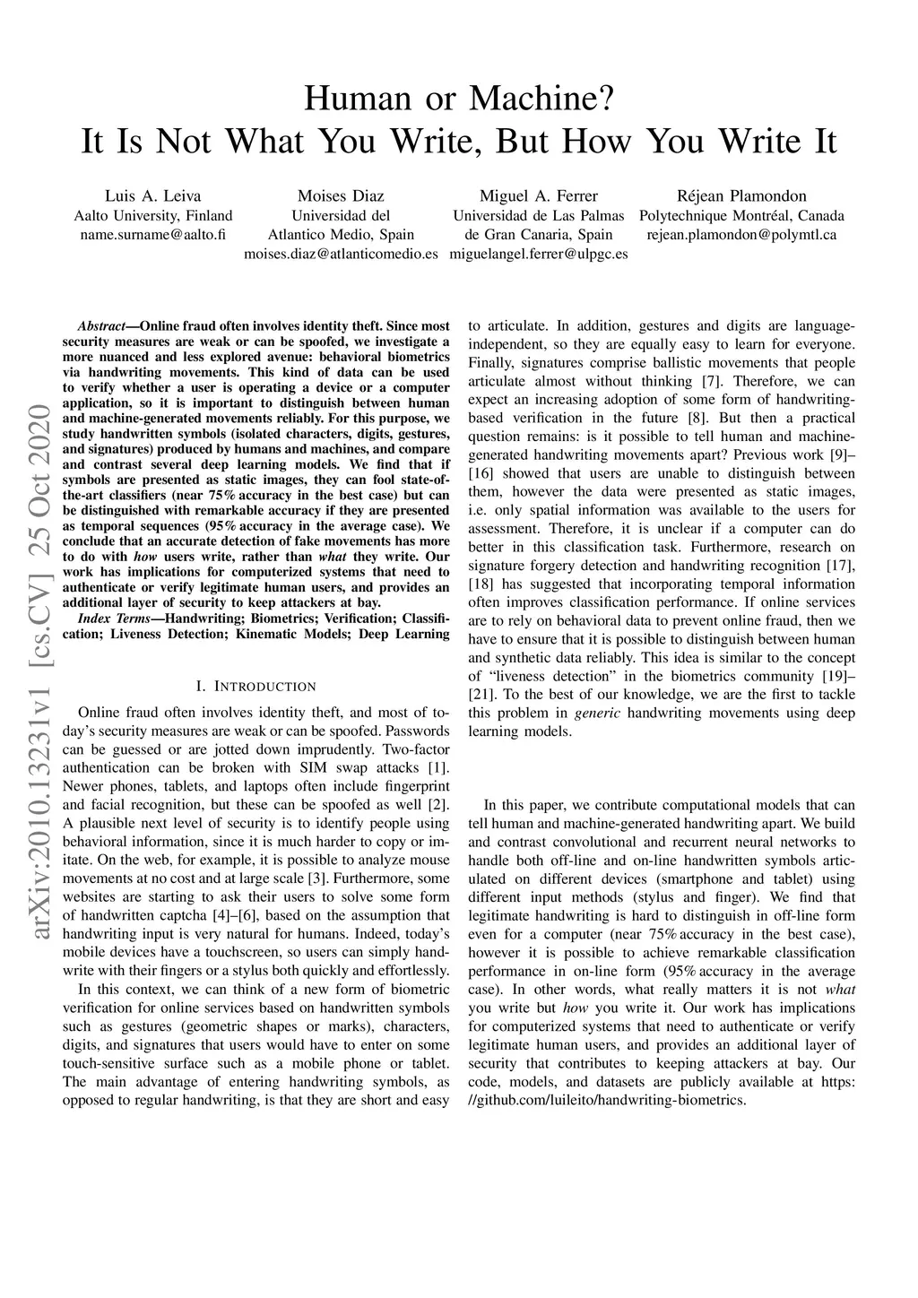Online fraud often involves identity theft. Since most security measures are weak or can be spoofed, we investigate a more nuanced and less explored avenue: behavioral biometrics via handwriting movements. This kind of data can be used to verify whether a user is operating a device or a computer application, so it is important to distinguish between human and machine-generated movements reliably. For this purpose, we study handwritten symbols (isolated characters, digits, gestures, and signatures) produced by humans and machines, and compare and contrast several deep learning models. We find that if symbols are presented as static images, they can fool state-of-the-art classifiers (near 75% accuracy in the best case) but can be distinguished with remarkable accuracy if they are presented as temporal sequences (95% accuracy in the average case). We conclude that an accurate detection of fake movements has more to do with how users write, rather than what they write. Our work has implications for computerized systems that need to authenticate or verify legitimate human users, and provides an additional layer of security to keep attackers at bay.