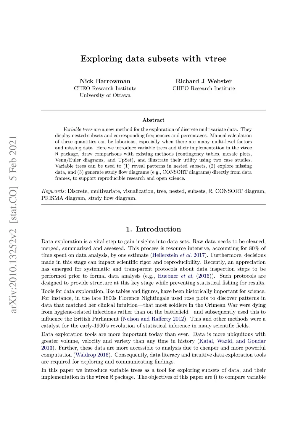 Variable trees are a new method for the exploration of discrete multivariate data. They display nested subsets and corresponding frequencies and percentages. Manual calculation of these quantities can be laborious, especially when there are many multi-level factors and missing data. Here we introduce variable trees and their implementation in the vtree R package, draw comparisons with existing methods (contingency tables, mosaic plots, Venn/Euler diagrams, and UpSet), and illustrate their utility using two case studies. Variable trees can be used to (1) reveal patterns in nested subsets, (2) explore missing data, and (3) generate study flow diagrams (e.g., CONSORT diagrams) directly from data frames, to support reproducible research and open science.