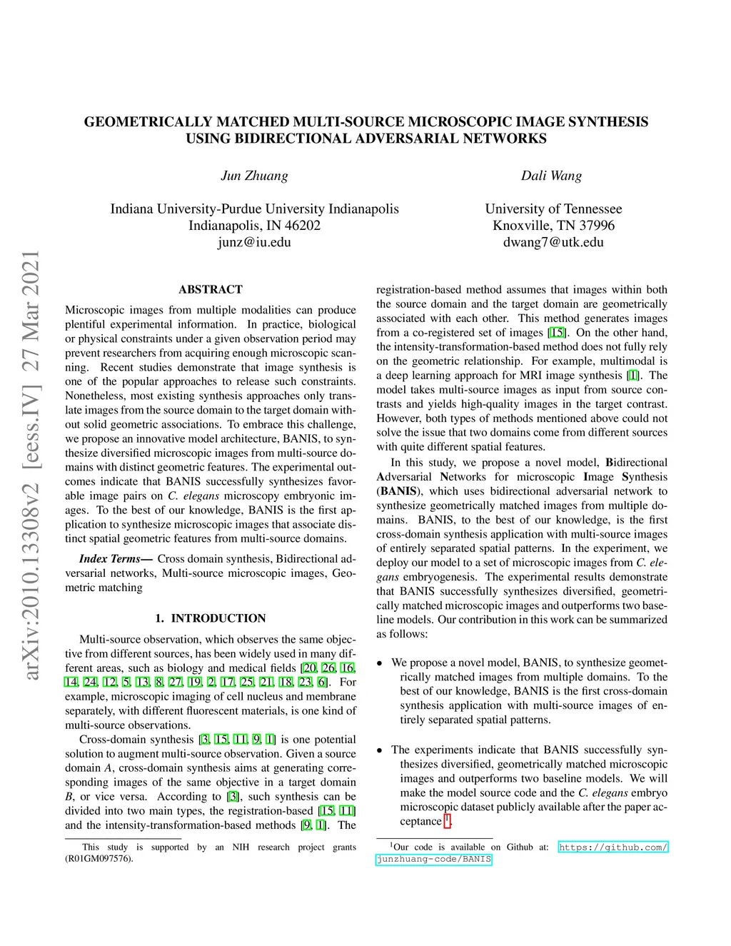 Microscopic images from multiple modalities can produce plentiful experimental information. In practice, biological or physical constraints under a given observation period may prevent researchers from acquiring enough microscopic scanning. Recent studies demonstrate that image synthesis is one of the popular approaches to release such constraints. Nonetheless, most existing synthesis approaches only translate images from the source domain to the target domain without solid geometric associations. To embrace this challenge, we propose an innovative model architecture, BANIS, to synthesize diversified microscopic images from multi-source domains with distinct geometric features. The experimental outcomes indicate that BANIS successfully synthesizes favorable image pairs on C. elegans microscopy embryonic images. To the best of our knowledge, BANIS is the first application to synthesize microscopic images that associate distinct spatial geometric features from multi-source domains.