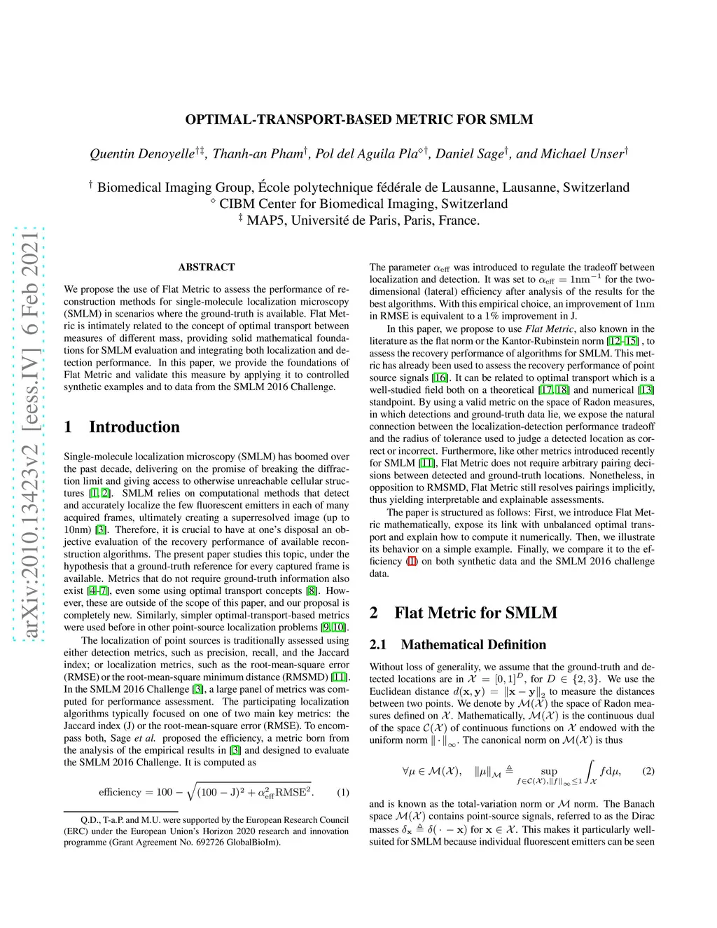 We propose the use of Flat Metric to assess the performance of reconstruction methods for single-molecule localization microscopy (SMLM) in scenarios where the ground-truth is available. Flat Metric is intimately related to the concept of optimal transport between measures of different mass, providing solid mathematical foundations for SMLM evaluation and integrating both localization and detection performance. In this paper, we provide the foundations of Flat Metric and validate this measure by applying it to controlled synthetic examples and to data from the SMLM 2016 Challenge.