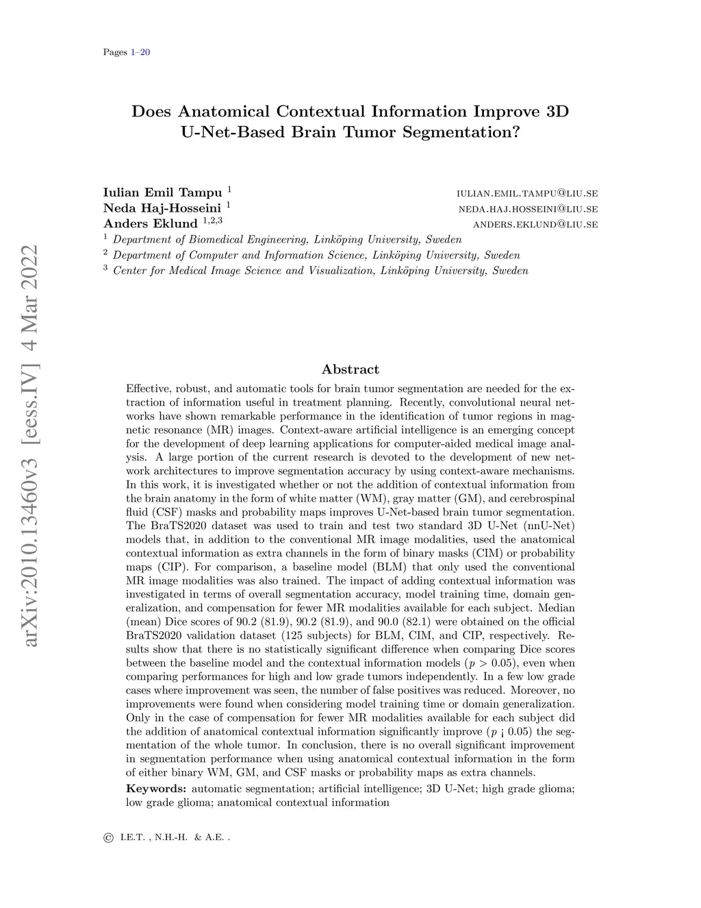 Does anatomical contextual information improve 3D U-Net based brain