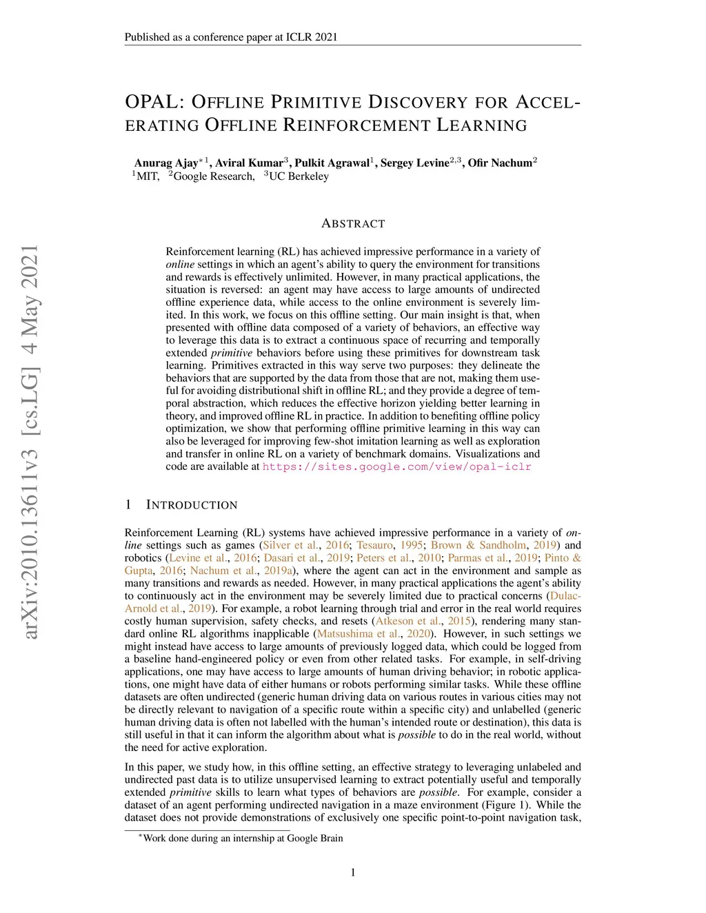 Reinforcement learning (RL) has achieved impressive performance in a variety of online settings in which an agent's ability to query the environment for transitions and rewards is effectively unlimited. However, in many practical applications, the situation is reversed: an agent may have access to large amounts of undirected offline experience data, while access to the online environment is severely limited. In this work, we focus on this offline setting. Our main insight is that, when presented with offline data composed of a variety of behaviors, an effective way to leverage this data is to extract a continuous space of recurring and temporally extended primitive behaviors before using these primitives for downstream task learning. Primitives extracted in this way serve two purposes: they delineate the behaviors that are supported by the data from those that are not, making them useful for avoiding distributional shift in offline RL; and they provide a degree of temporal abstraction, which reduces the effective horizon yielding better learning in theory, and improved offline RL in practice. In addition to benefiting offline policy optimization, we show that performing offline primitive learning in this way can also be leveraged for improving few-shot imitation learning as well as exploration and transfer in online RL on a variety of benchmark domains. Visualizations are available at https://sites.google.com/view/opal-iclr