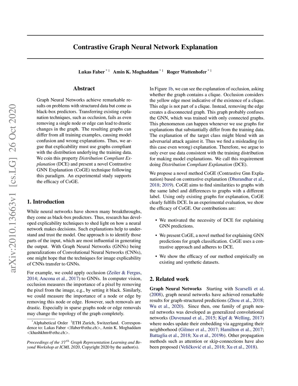 Graph Neural Networks achieve remarkable results on problems with structured data but come as black-box predictors. Transferring existing explanation techniques, such as occlusion, fails as even removing a single node or edge can lead to drastic changes in the graph. The resulting graphs can differ from all training examples, causing model confusion and wrong explanations. Thus, we argue that explicability must use graphs compliant with the distribution underlying the training data. We coin this property Distribution Compliant Explanation (DCE) and present a novel Contrastive GNN Explanation (CoGE) technique following this paradigm. An experimental study supports the efficacy of CoGE.