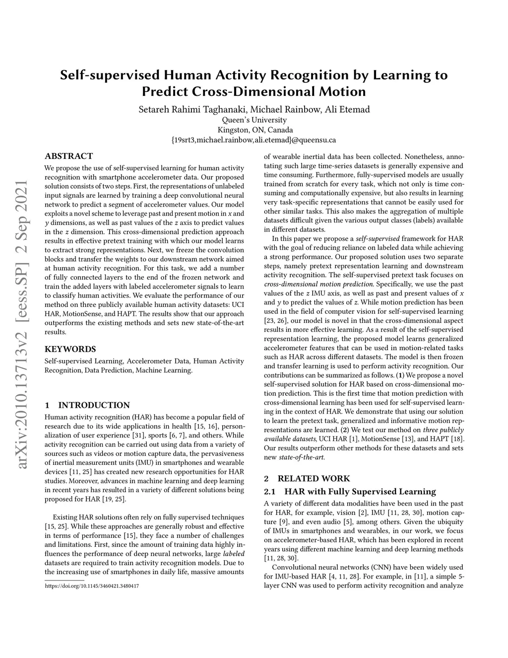 We propose the use of self-supervised learning for human activity recognition with smartphone accelerometer data. Our proposed solution consists of two steps. First, the representations of unlabeled input signals are learned by training a deep convolutional neural network to predict a segment of accelerometer values. Our model exploits a novel scheme to leverage past and present motion in x and y dimensions, as well as past values of the z axis to predict values in the z dimension. This cross-dimensional prediction approach results in effective pretext training with which our model learns to extract strong representations. Next, we freeze the convolution blocks and transfer the weights to our downstream network aimed at human activity recognition. For this task, we add a number of fully connected layers to the end of the frozen network and train the added layers with labeled accelerometer signals to learn to classify human activities. We evaluate the performance of our method on three publicly available human activity datasets: UCI HAR, MotionSense, and HAPT. The results show that our approach outperforms the existing methods and sets new state-of-the-art results.