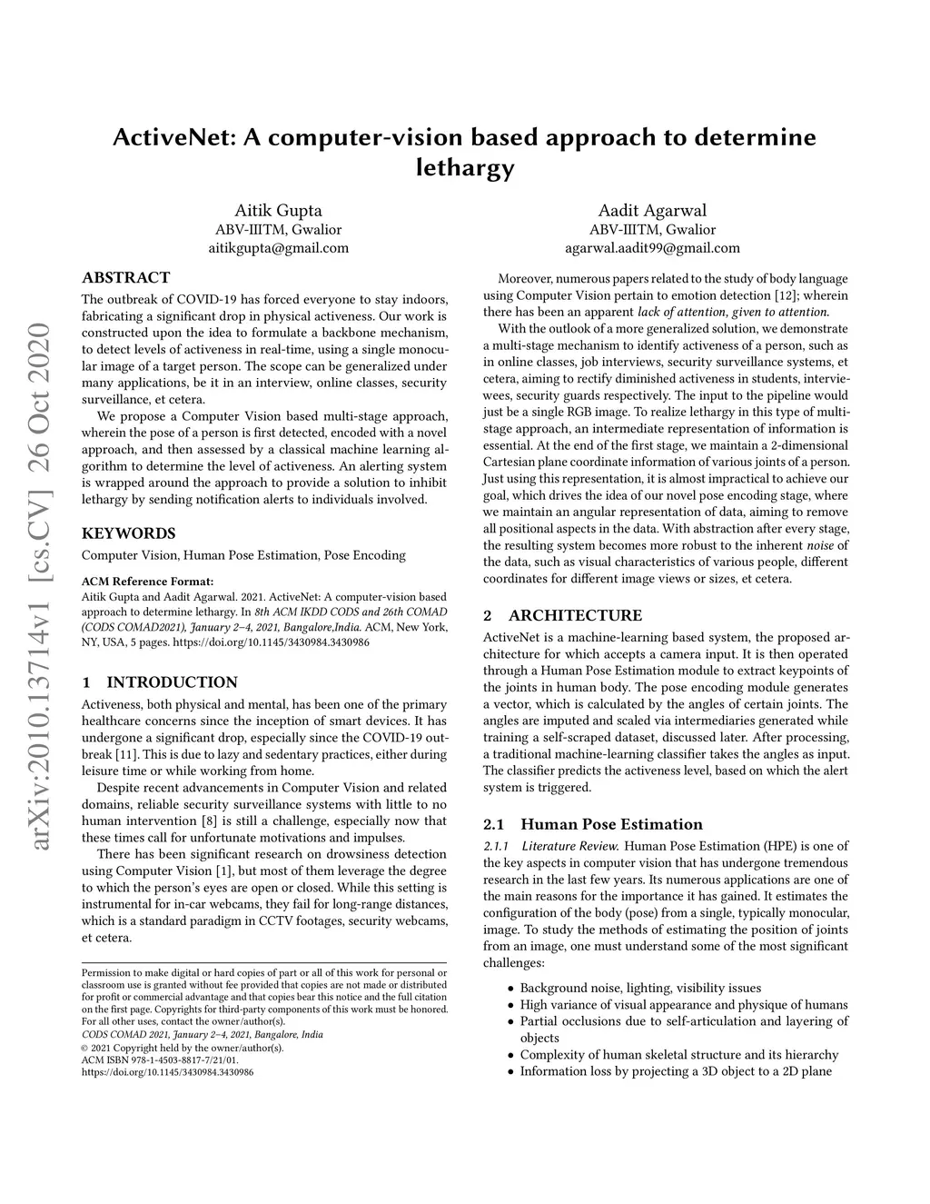 The outbreak of COVID-19 has forced everyone to stay indoors, fabricating a significant drop in physical activeness. Our work is constructed upon the idea to formulate a backbone mechanism, to detect levels of activeness in real-time, using a single monocular image of a target person. The scope can be generalized under many applications, be it in an interview, online classes, security surveillance, et cetera. We propose a Computer Vision based multi-stage approach, wherein the pose of a person is first detected, encoded with a novel approach, and then assessed by a classical machine learning algorithm to determine the level of activeness. An alerting system is wrapped around the approach to provide a solution to inhibit lethargy by sending notification alerts to individuals involved.