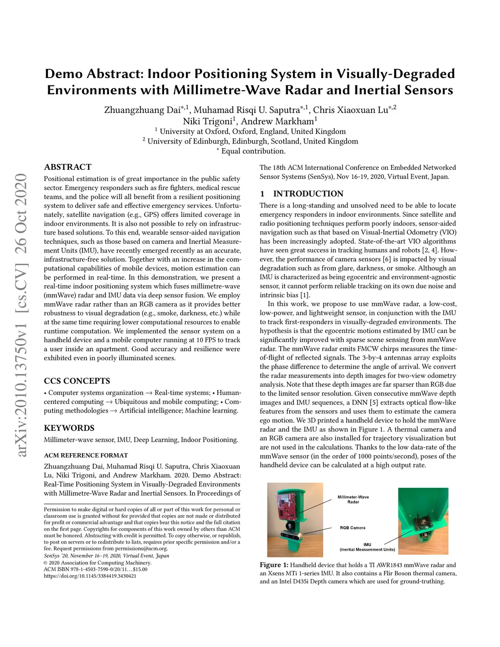 Positional estimation is of great importance in the public safety sector. Emergency responders such as fire fighters, medical rescue teams, and the police will all benefit from a resilient positioning system to deliver safe and effective emergency services. Unfortunately, satellite navigation (e.g., GPS) offers limited coverage in indoor environments. It is also not possible to rely on infrastructure based solutions. To this end, wearable sensor-aided navigation techniques, such as those based on camera and Inertial Measurement Units (IMU), have recently emerged recently as an accurate, infrastructure-free solution. Together with an increase in the computational capabilities of mobile devices, motion estimation can be performed in real-time. In this demonstration, we present a real-time indoor positioning system which fuses millimetre-wave (mmWave) radar and IMU data via deep sensor fusion. We employ mmWave radar rather than an RGB camera as it provides better robustness to visual degradation (e.g., smoke, darkness, etc.) while at the same time requiring lower computational resources to enable runtime computation. We implemented the sensor system on a handheld device and a mobile computer running at 10 FPS to track a user inside an apartment. Good accuracy and resilience were exhibited even in poorly illuminated scenes.