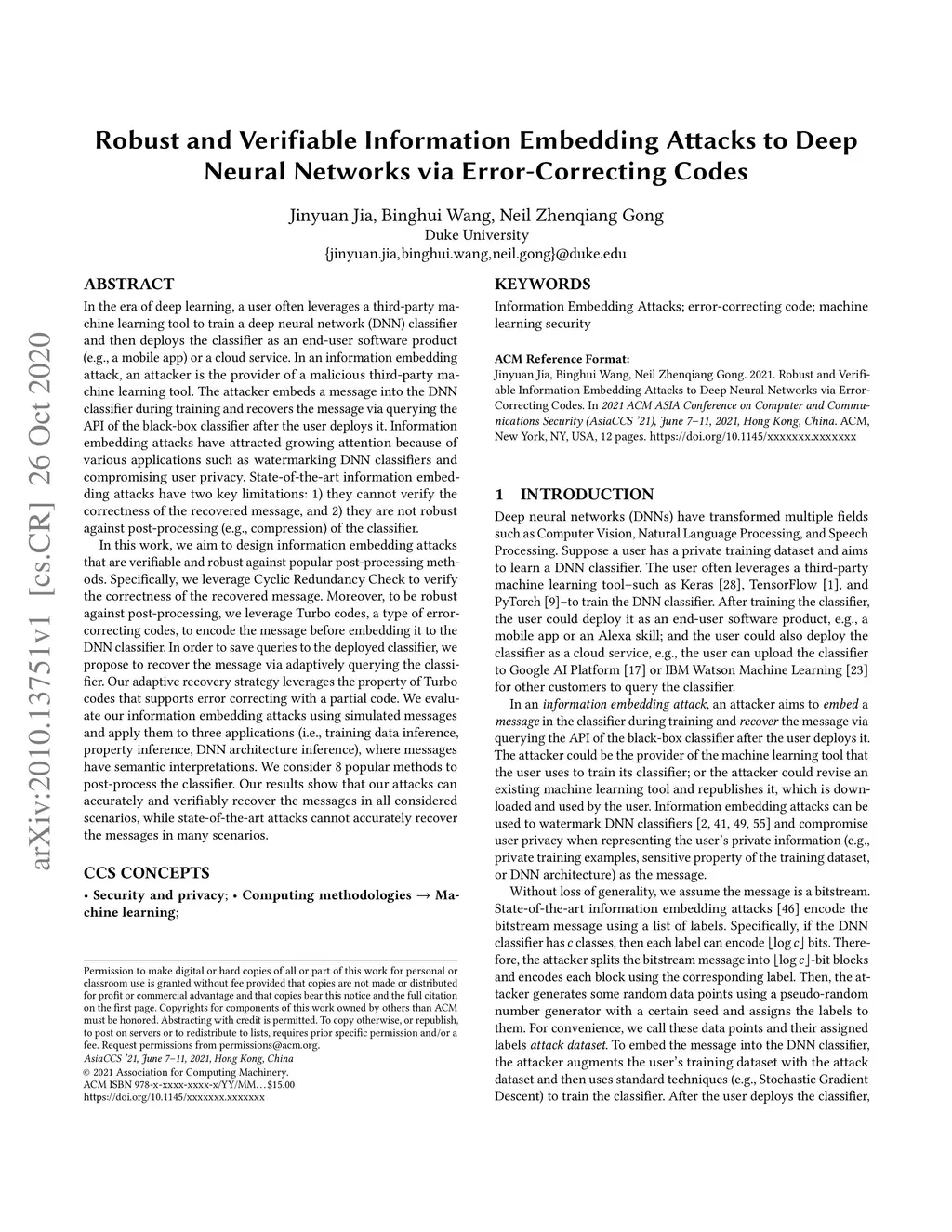 In the era of deep learning, a user often leverages a third-party machine learning tool to train a deep neural network (DNN) classifier and then deploys the classifier as an end-user software product or a cloud service. In an information embedding attack, an attacker is the provider of a malicious third-party machine learning tool. The attacker embeds a message into the DNN classifier during training and recovers the message via querying the API of the black-box classifier after the user deploys it. Information embedding attacks have attracted growing attention because of various applications such as watermarking DNN classifiers and compromising user privacy. State-of-the-art information embedding attacks have two key limitations: 1) they cannot verify the correctness of the recovered message, and 2) they are not robust against post-processing of the classifier. In this work, we aim to design information embedding attacks that are verifiable and robust against popular post-processing methods. Specifically, we leverage Cyclic Redundancy Check to verify the correctness of the recovered message. Moreover, to be robust against post-processing, we leverage Turbo codes, a type of error-correcting codes, to encode the message before embedding it to the DNN classifier. We propose to recover the message via adaptively querying the classifier to save queries. Our adaptive recovery strategy leverages the property of Turbo codes that supports error correcting with a partial code. We evaluate our information embedding attacks using simulated messages and apply them to three applications, where messages have semantic interpretations. We consider 8 popular methods to post-process the classifier. Our results show that our attacks can accurately and verifiably recover the messages in all considered scenarios, while state-of-the-art attacks cannot accurately recover the messages in many scenarios.