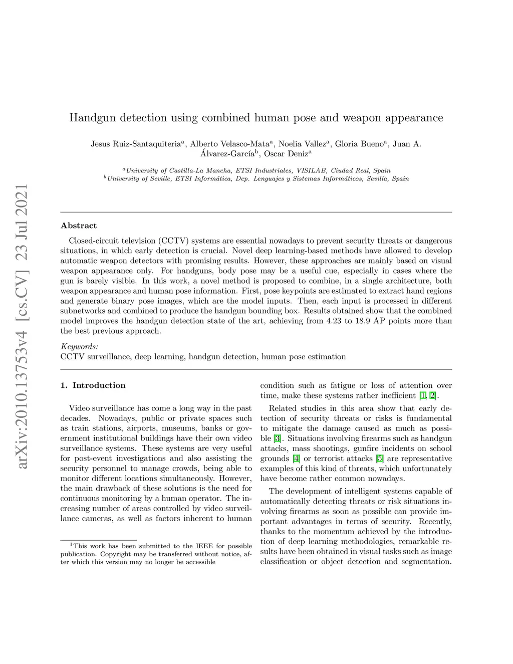 Closed-circuit television (CCTV) systems are essential nowadays to prevent security threats or dangerous situations, in which early detection is crucial. Novel deep learning-based methods have allowed to develop automatic weapon detectors with promising results. However, these approaches are mainly based on visual weapon appearance only. For handguns, body pose may be a useful cue, especially in cases where the gun is barely visible. In this work, a novel method is proposed to combine, in a single architecture, both weapon appearance and human pose information. First, pose keypoints are estimated to extract hand regions and generate binary pose images, which are the model inputs. Then, each input is processed in different subnetworks and combined to produce the handgun bounding box. Results obtained show that the combined model improves the handgun detection state of the art, achieving from 4.23 to 18.9 AP points more than the best previous approach.