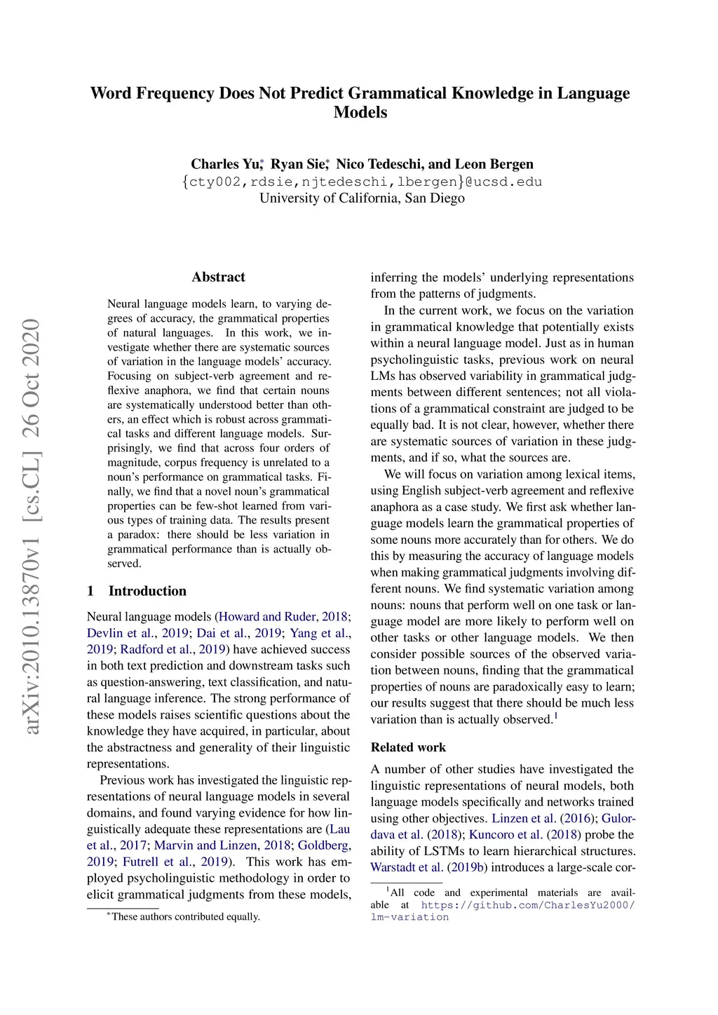 Neural language models learn, to varying degrees of accuracy, the grammatical properties of natural languages. In this work, we investigate whether there are systematic sources of variation in the language models' accuracy. Focusing on subject-verb agreement and reflexive anaphora, we find that certain nouns are systematically understood better than others, an effect which is robust across grammatical tasks and different language models. Surprisingly, we find that across four orders of magnitude, corpus frequency is unrelated to a noun's performance on grammatical tasks. Finally, we find that a novel noun's grammatical properties can be few-shot learned from various types of training data. The results present a paradox: there should be less variation in grammatical performance than is actually observed.