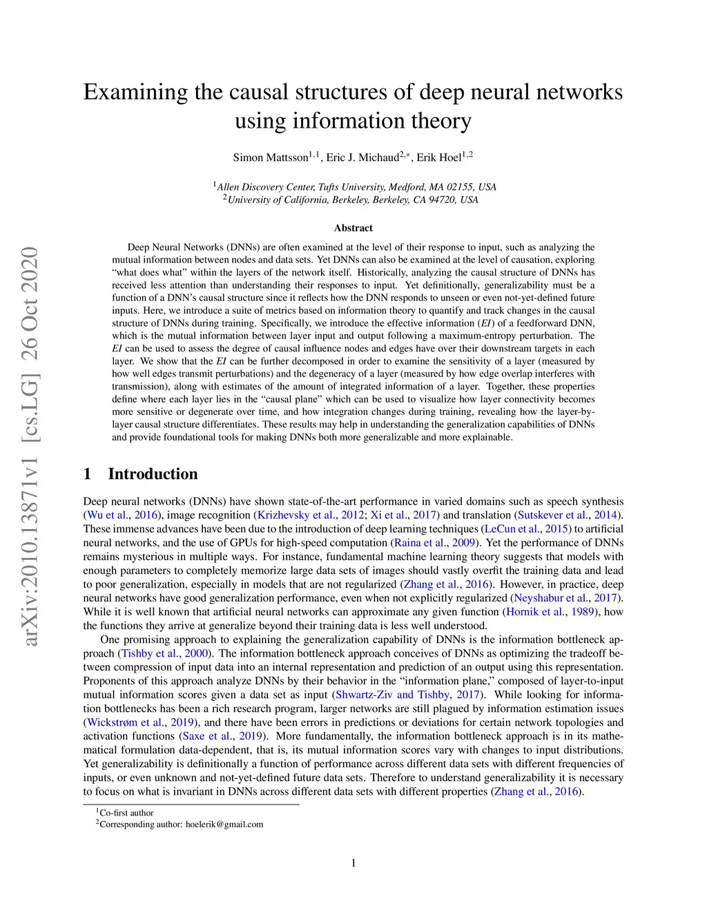 Deep Neural Networks (DNNs) are often examined at the level of their response to input, such as analyzing the mutual information between nodes and data sets. Yet DNNs can also be examined at the level of causation, exploring "what does what" within the layers of the network itself. Historically, analyzing the causal structure of DNNs has received less attention than understanding their responses to input. Yet definitionally, generalizability must be a function of a DNN's causal structure since it reflects how the DNN responds to unseen or even not-yet-defined future inputs. Here, we introduce a suite of metrics based on information theory to quantify and track changes in the causal structure of DNNs during training. Specifically, we introduce the effective information (EI) of a feedforward DNN, which is the mutual information between layer input and output following a maximum-entropy perturbation. The EI can be used to assess the degree of causal influence nodes and edges have over their downstream targets in each layer. We show that the EI can be further decomposed in order to examine the sensitivity of a layer (measured by how well edges transmit perturbations) and the degeneracy of a layer (measured by how edge overlap interferes with transmission), along with estimates of the amount of integrated information of a layer. Together, these properties define where each layer lies in the "causal plane" which can be used to visualize how layer connectivity becomes more sensitive or degenerate over time, and how integration changes during training, revealing how the layer-by-layer causal structure differentiates. These results may help in understanding the generalization capabilities of DNNs and provide foundational tools for making DNNs both more generalizable and more explainable.