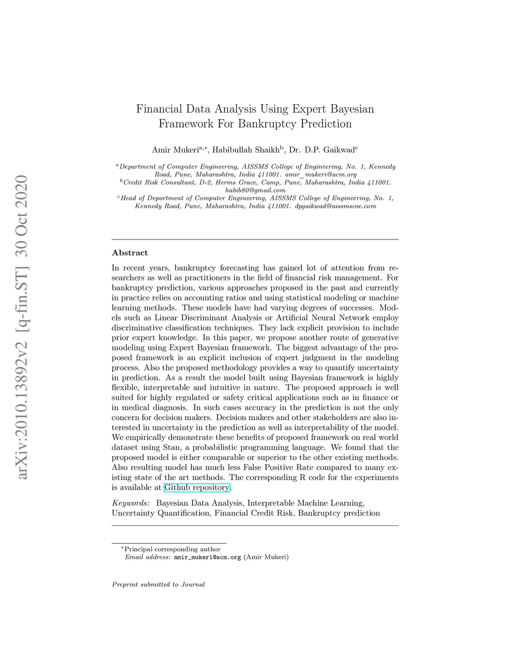 Financial Data Analysis Using Expert Bayesian Framework For Bankruptcy