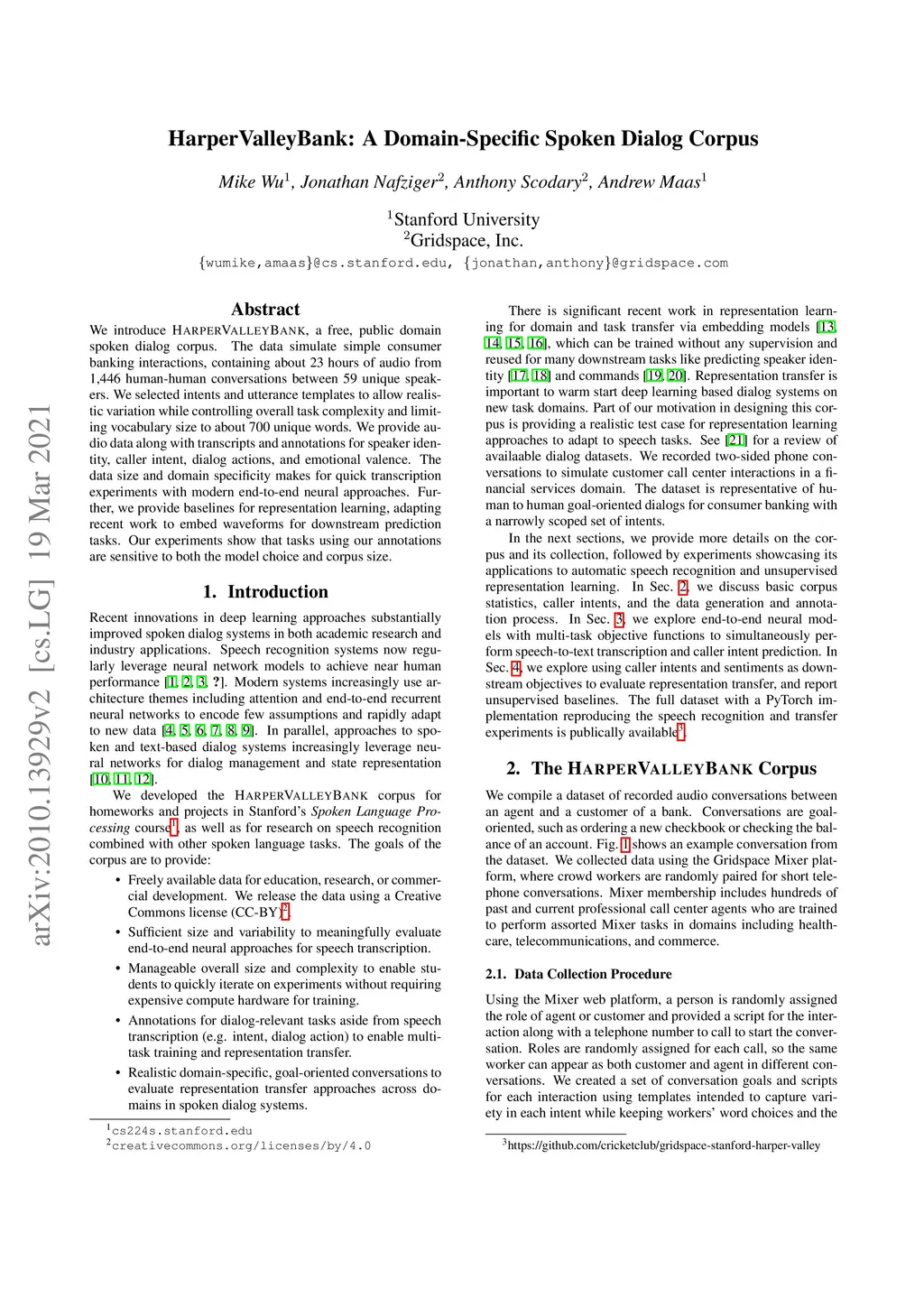 We introduce HarperValleyBank, a free, public domain spoken dialog corpus. The data simulate simple consumer banking interactions, containing about 23 hours of audio from 1,446 human-human conversations between 59 unique speakers. We selected intents and utterance templates to allow realistic variation while controlling overall task complexity and limiting vocabulary size to about 700 unique words. We provide audio data along with transcripts and annotations for speaker identity, caller intent, dialog actions, and emotional valence. The data size and domain specificity makes for quick transcription experiments with modern end-to-end neural approaches. Further, we provide baselines for representation learning, adapting recent work to embed waveforms for downstream prediction tasks. Our experiments show that tasks using our annotations are sensitive to both the model choice and corpus size.