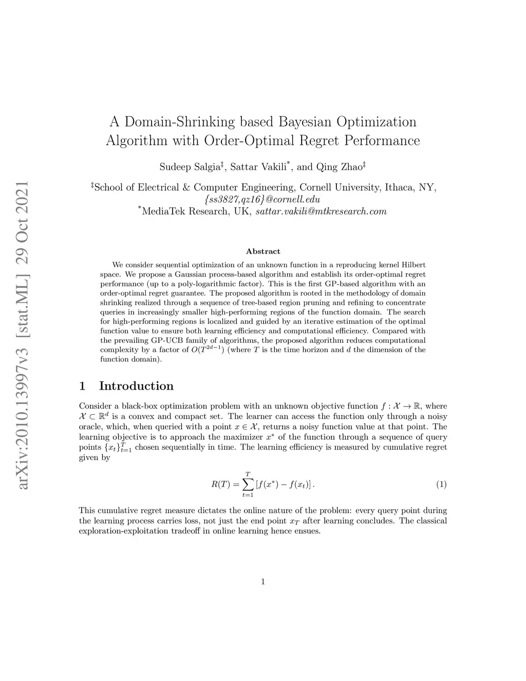 We consider sequential optimization of an unknown function in a reproducing kernel Hilbert space. We propose a Gaussian process-based algorithm and establish its order-optimal regret performance (up to a poly-logarithmic factor). This is the first GP-based algorithm with an order-optimal regret guarantee. The proposed algorithm is rooted in the methodology of domain shrinking realized through a sequence of tree-based region pruning and refining to concentrate queries in increasingly smaller high-performing regions of the function domain. The search for high-performing regions is localized and guided by an iterative estimation of the optimal function value to ensure both learning efficiency and computational efficiency. Compared with the prevailing GP-UCB family of algorithms, the proposed algorithm reduces computational complexity by a factor of (where is the time horizon and the dimension of the function domain).