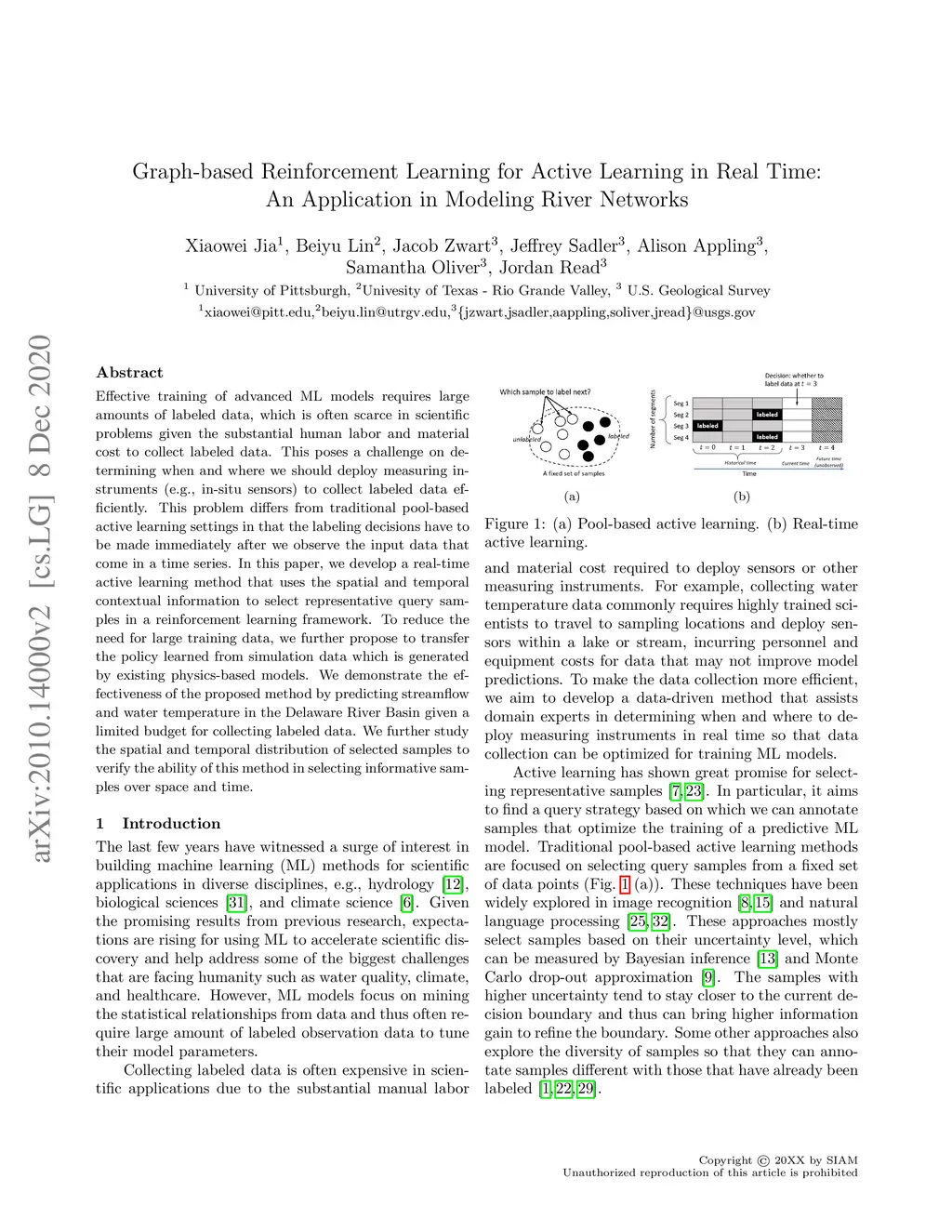 Effective training of advanced ML models requires large amounts of labeled data, which is often scarce in scientific problems given the substantial human labor and material cost to collect labeled data. This poses a challenge on determining when and where we should deploy measuring instruments (e.g., in-situ sensors) to collect labeled data efficiently. This problem differs from traditional pool-based active learning settings in that the labeling decisions have to be made immediately after we observe the input data that come in a time series. In this paper, we develop a real-time active learning method that uses the spatial and temporal contextual information to select representative query samples in a reinforcement learning framework. To reduce the need for large training data, we further propose to transfer the policy learned from simulation data which is generated by existing physics-based models. We demonstrate the effectiveness of the proposed method by predicting streamflow and water temperature in the Delaware River Basin given a limited budget for collecting labeled data. We further study the spatial and temporal distribution of selected samples to verify the ability of this method in selecting informative samples over space and time.
