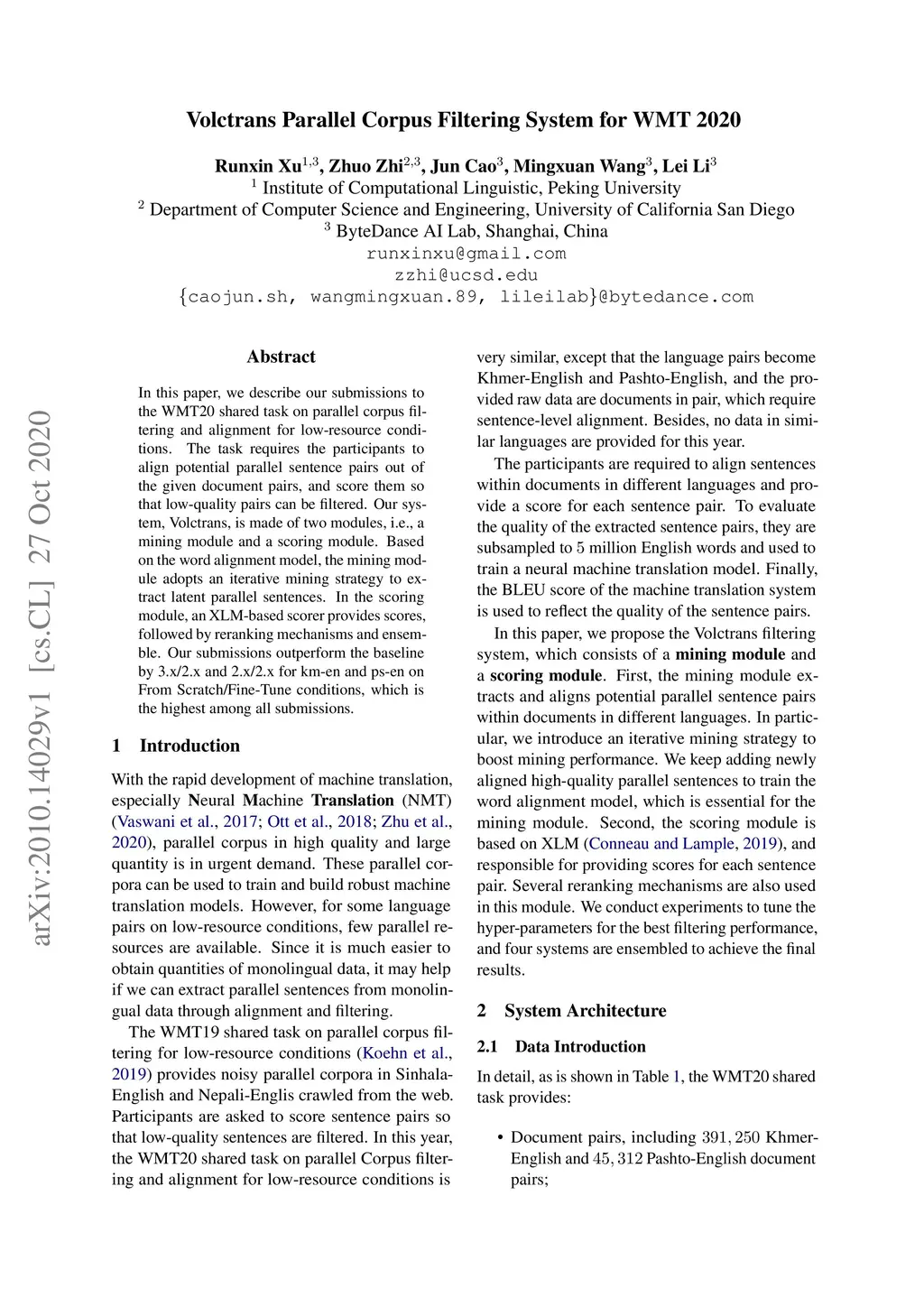 In this paper, we describe our submissions to the WMT20 shared task on parallel corpus filtering and alignment for low-resource conditions. The task requires the participants to align potential parallel sentence pairs out of the given document pairs, and score them so that low-quality pairs can be filtered. Our system, Volctrans, is made of two modules, i.e., a mining module and a scoring module. Based on the word alignment model, the mining module adopts an iterative mining strategy to extract latent parallel sentences. In the scoring module, an XLM-based scorer provides scores, followed by reranking mechanisms and ensemble. Our submissions outperform the baseline by 3.x/2.x and 2.x/2.x for km-en and ps-en on From Scratch/Fine-Tune conditions, which is the highest among all submissions.