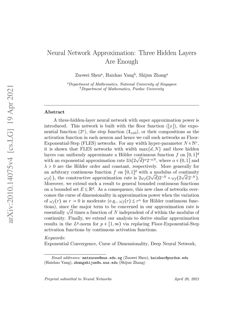 A three-hidden-layer neural network with super approximation power is introduced. This network is built with the floor function (), the exponential function (), the step function (), or their compositions as the activation function in each neuron and hence we call such networks as Floor-Exponential-Step (FLES) networks. For any width hyper-parameter , it is shown that FLES networks with width and three hidden layers can uniformly approximate a H\"older continuous function on with an exponential approximation rate , where and are the H\"older order and constant, respectively. More generally for an arbitrary continuous function on with a modulus of continuity , the constructive approximation rate is . Moreover, we extend such a result to general bounded continuous functions on a bounded set . As a consequence, this new class of networks overcomes the curse of dimensionality in approximation power when the variation of as is moderate (e.g., for H\"older continuous functions), since the major term to be concerned in our approximation rate is essentially times a function of independent of within the modulus of continuity. Finally, we extend our analysis to derive similar approximation results in the -norm for via replacing Floor-Exponential-Step activation functions by continuous activation functions.