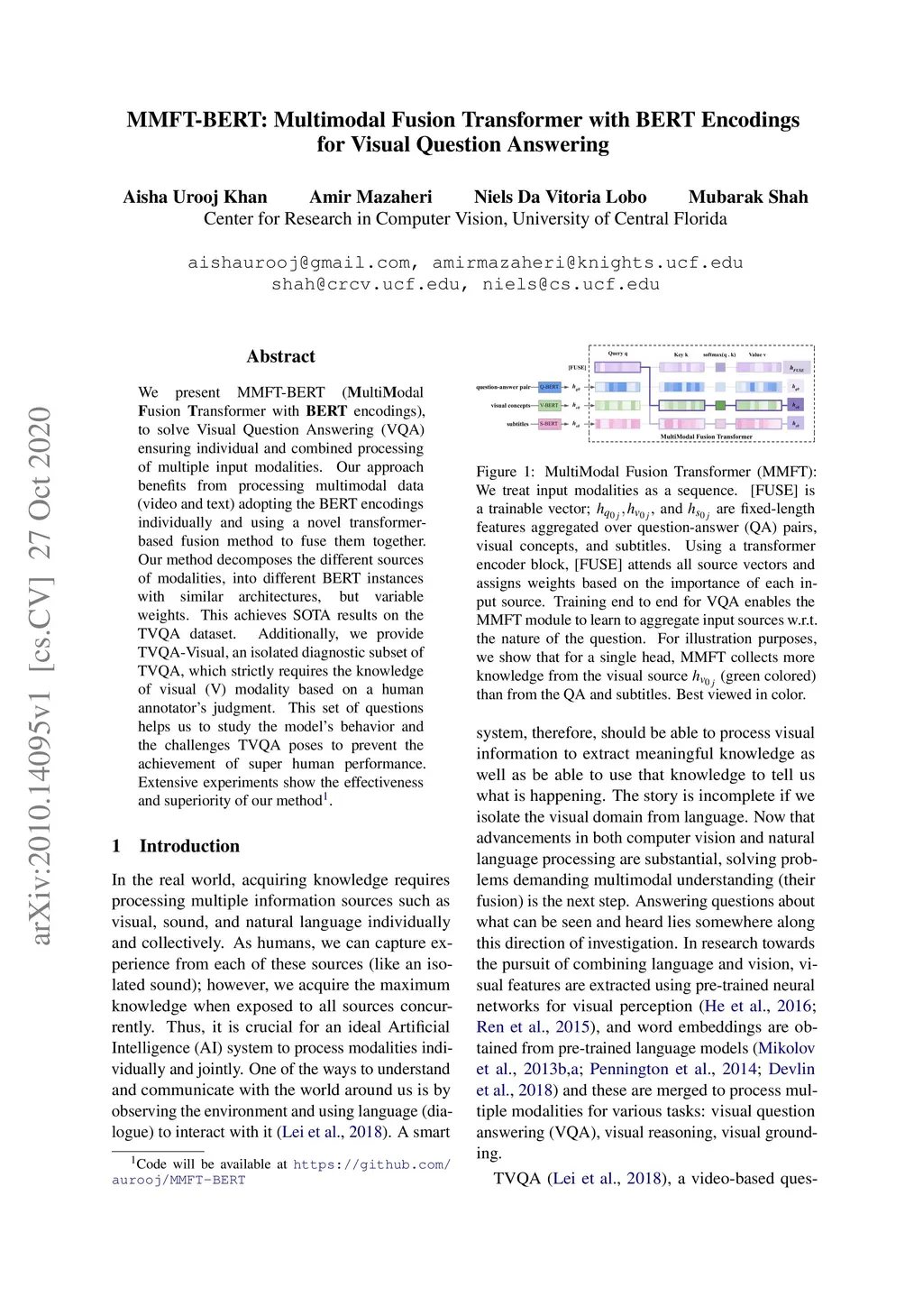 MMFT-BERT: Multimodal Fusion Transformer with BERT Encodings for Visual