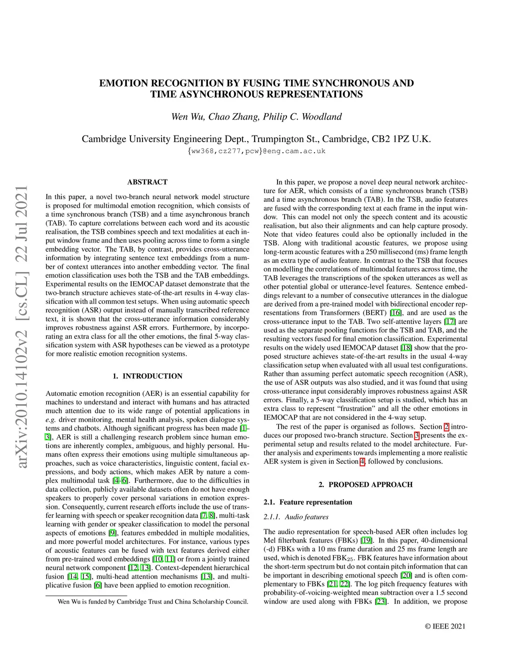 In this paper, a novel two-branch neural network model structure is proposed for multimodal emotion recognition, which consists of a time synchronous branch (TSB) and a time asynchronous branch (TAB). To capture correlations between each word and its acoustic realisation, the TSB combines speech and text modalities at each input window frame and then does pooling across time to form a single embedding vector. The TAB, by contrast, provides cross-utterance information by integrating sentence text embeddings from a number of context utterances into another embedding vector. The final emotion classification uses both the TSB and the TAB embeddings. Experimental results on the IEMOCAP dataset demonstrate that the two-branch structure achieves state-of-the-art results in 4-way classification with all common test setups. When using automatic speech recognition (ASR) output instead of manually transcribed reference text, it is shown that the cross-utterance information considerably improves the robustness against ASR errors. Furthermore, by incorporating an extra class for all the other emotions, the final 5-way classification system with ASR hypotheses can be viewed as a prototype for more realistic emotion recognition systems.