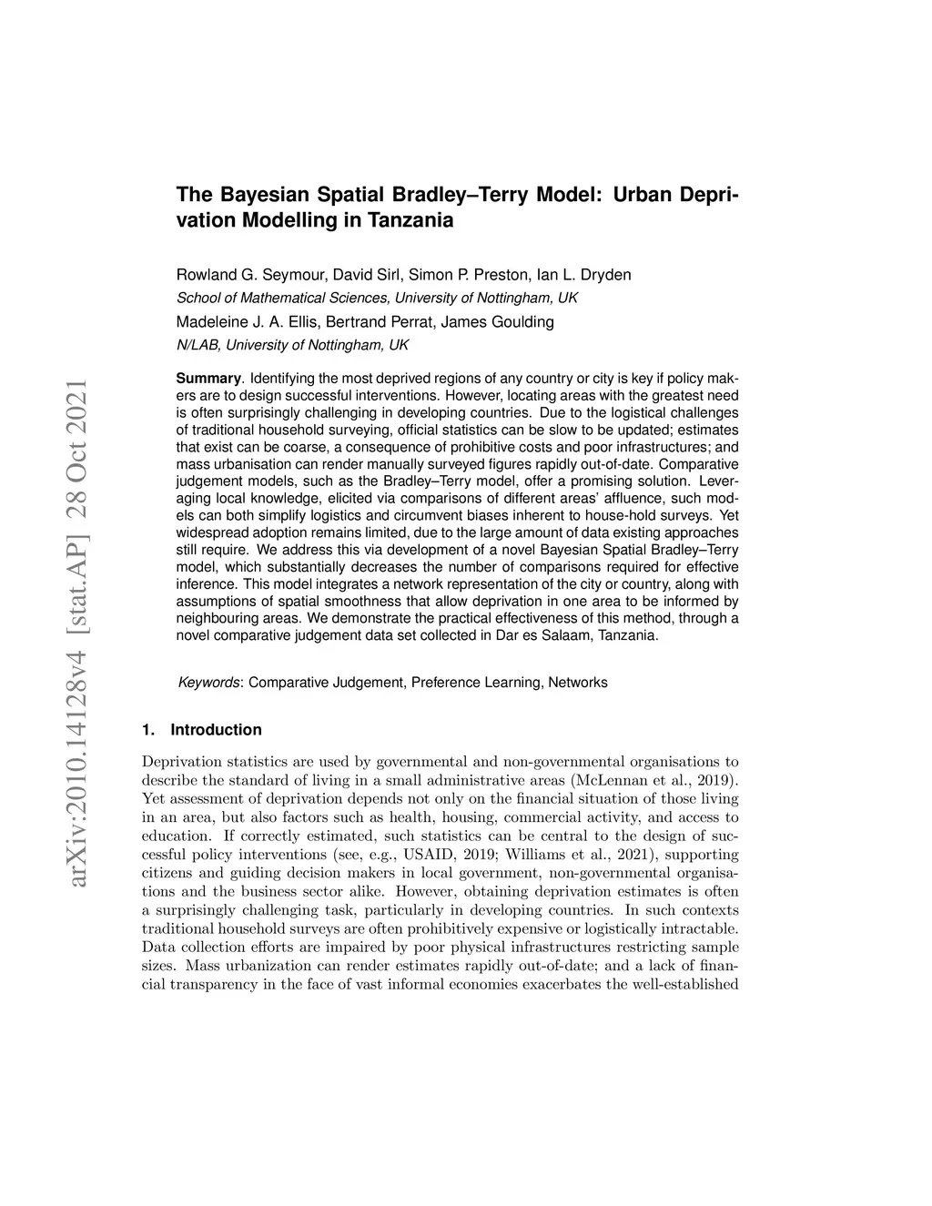 Finding the deprived areas in any country or city can allow policy makers to design interventions which support citizens in these areas. Locating these areas is often challenging in developing countries where official statistics may not be collected or are unreliable. Comparative judgement models, such as the Bradley--Terry model, offer a solution leveraging local knowledge by comparing different areas based on affluence. Existing comparative judgement methods require a large amount of data to be collected, which can be expensive and time consuming, particularly in developing countries. In this article we develop the Bayesian Spatial Bradley--Terry model, which substantially decreases the amount of data that needs to be collected. We do this by constructing a network representation of the city and incorporating an assumption of spatial smoothness, meaning we can learn about the level of deprivation in one area from neighbouring areas. We demonstrate our method on a novel comparative judgement data set collected in Dar es Salaam, Tanzania, where we are able to identify several slums and the level of deprivation of each slum.