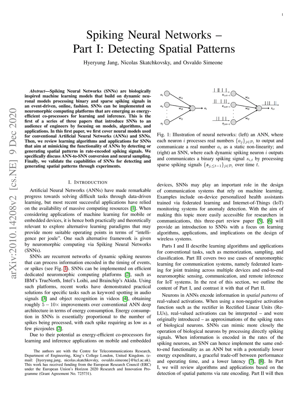 Spiking Neural Networks -- Part I: Detecting Spatial Patterns