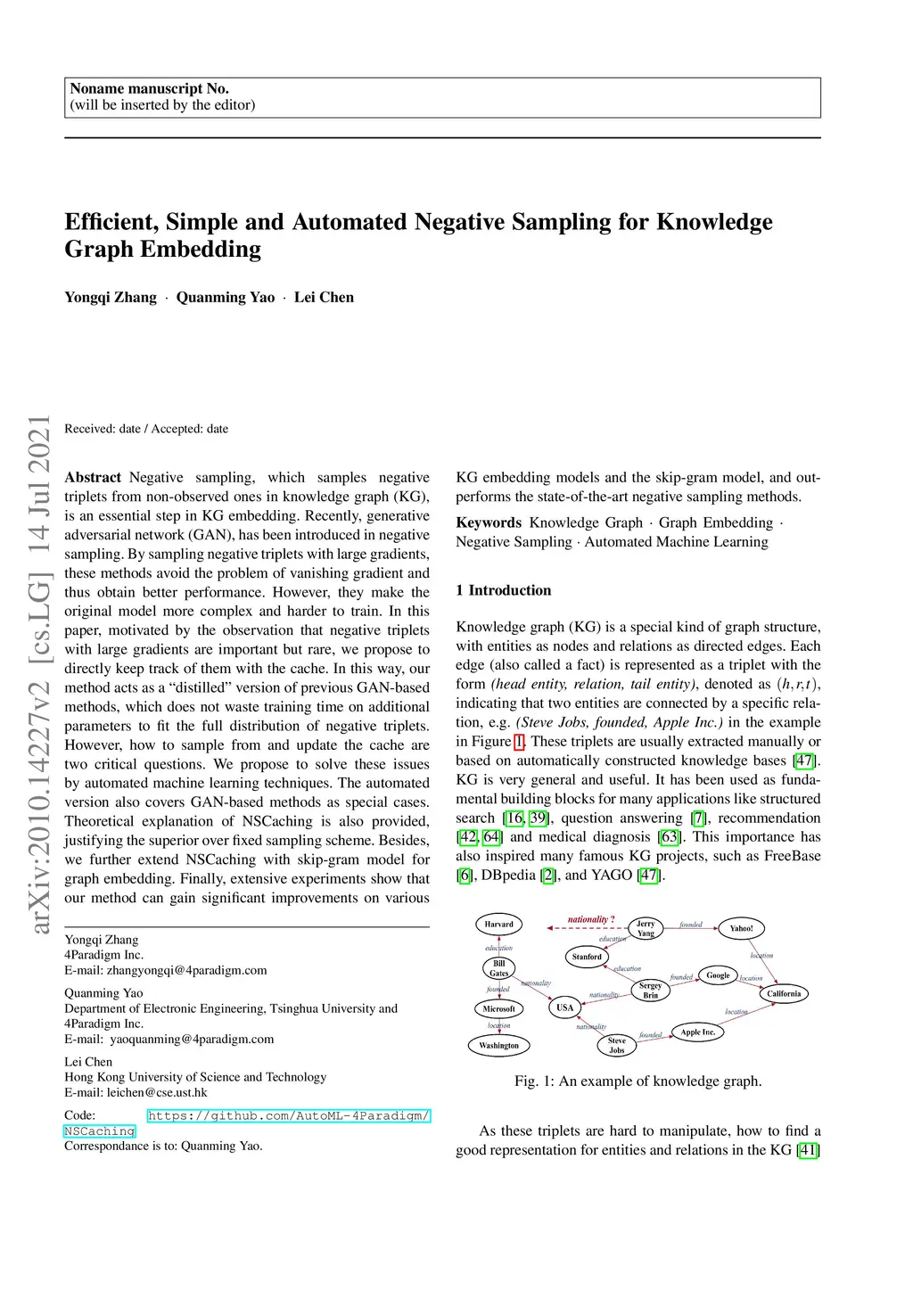 Efficient, Simple and Automated Negative Sampling for Knowledge Graph