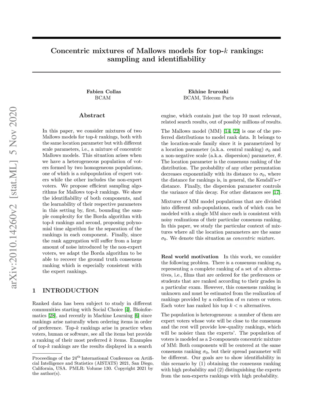 In this paper, we consider mixtures of two Mallows models for top- rankings, both with the same location parameter but with different scale parameters, i.e., a mixture of concentric Mallows models. This situation arises when we have a heterogeneous population of voters formed by two homogeneous populations, one of which is a subpopulation of expert voters while the other includes the non-expert voters. We propose efficient sampling algorithms for Mallows top- rankings. We show the identifiability of both components, and the learnability of their respective parameters in this setting by, first, bounding the sample complexity for the Borda algorithm with top- rankings and second, proposing polynomial time algorithm for the separation of the rankings in each component. Finally, since the rank aggregation will suffer from a large amount of noise introduced by the non-expert voters, we adapt the Borda algorithm to be able to recover the ground truth consensus ranking which is especially consistent with the expert rankings.