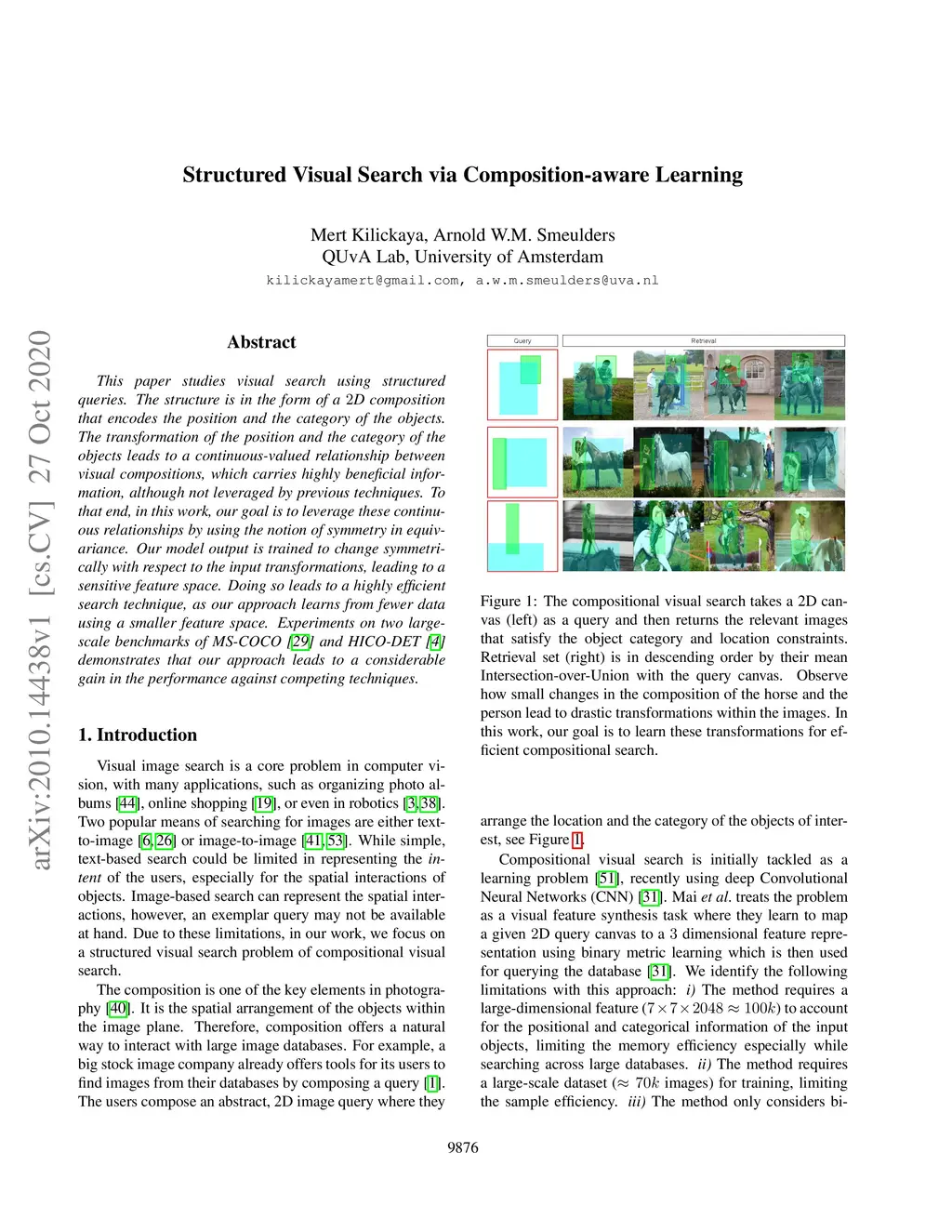 This paper studies visual search using structured queries. The structure is in the form of a 2D composition that encodes the position and the category of the objects. The transformation of the position and the category of the objects leads to a continuous-valued relationship between visual compositions, which carries highly beneficial information, although not leveraged by previous techniques. To that end, in this work, our goal is to leverage these continuous relationships by using the notion of symmetry in equivariance. Our model output is trained to change symmetrically with respect to the input transformations, leading to a sensitive feature space. Doing so leads to a highly efficient search technique, as our approach learns from fewer data using a smaller feature space. Experiments on two large-scale benchmarks of MS-COCO and HICO-DET demonstrates that our approach leads to a considerable gain in the performance against competing techniques.