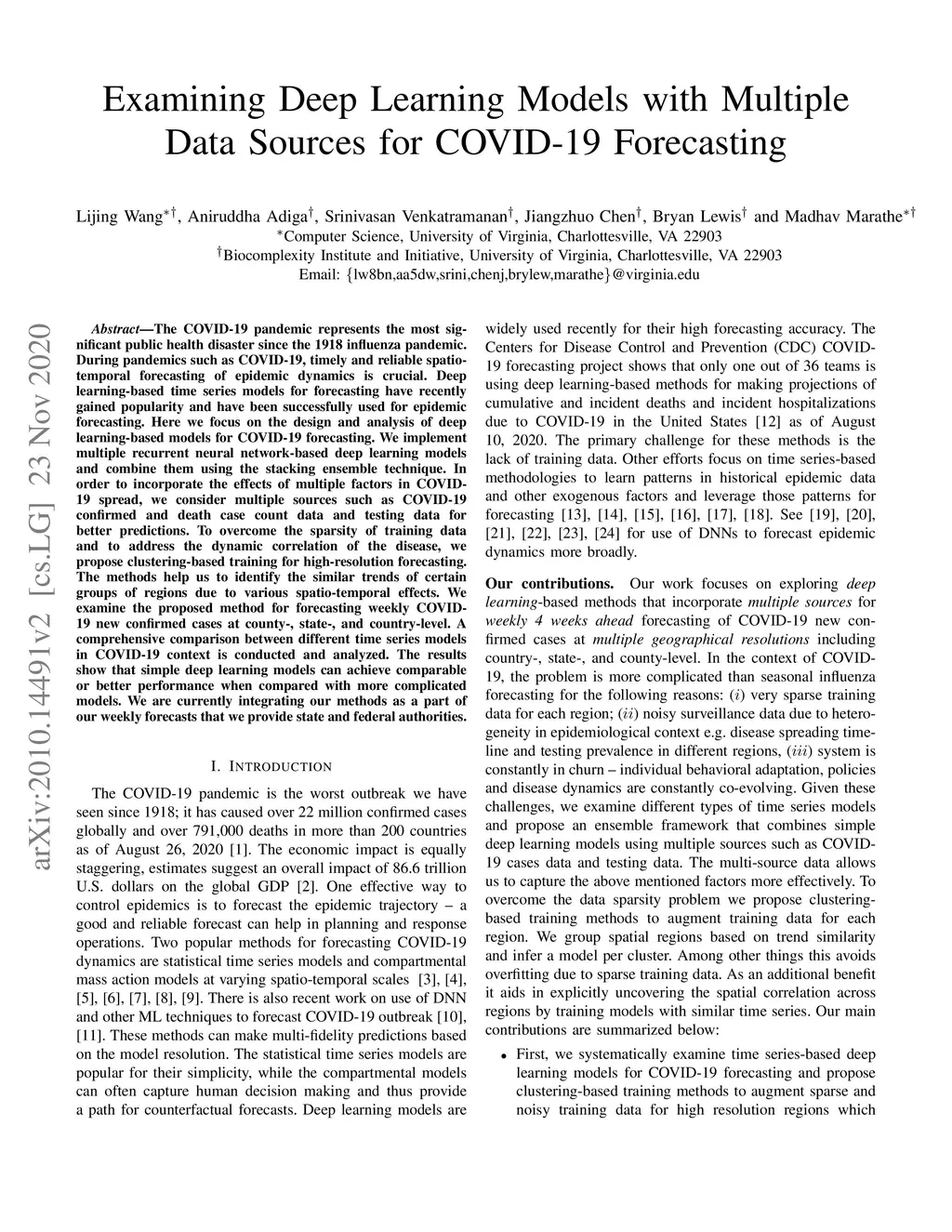 The COVID-19 pandemic represents the most significant public health disaster since the 1918 influenza pandemic. During pandemics such as COVID-19, timely and reliable spatio-temporal forecasting of epidemic dynamics is crucial. Deep learning-based time series models for forecasting have recently gained popularity and have been successfully used for epidemic forecasting. Here we focus on the design and analysis of deep learning-based models for COVID-19 forecasting. We implement multiple recurrent neural network-based deep learning models and combine them using the stacking ensemble technique. In order to incorporate the effects of multiple factors in COVID-19 spread, we consider multiple sources such as COVID-19 confirmed and death case count data and testing data for better predictions. To overcome the sparsity of training data and to address the dynamic correlation of the disease, we propose clustering-based training for high-resolution forecasting. The methods help us to identify the similar trends of certain groups of regions due to various spatio-temporal effects. We examine the proposed method for forecasting weekly COVID-19 new confirmed cases at county-, state-, and country-level. A comprehensive comparison between different time series models in COVID-19 context is conducted and analyzed. The results show that simple deep learning models can achieve comparable or better performance when compared with more complicated models. We are currently integrating our methods as a part of our weekly forecasts that we provide state and federal authorities.