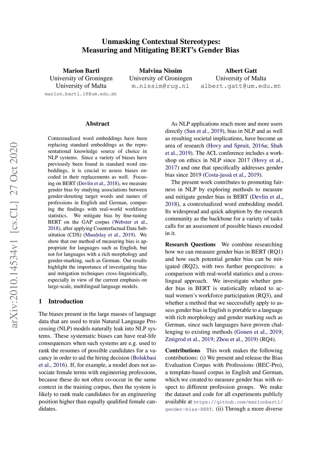 Unmasking Contextual Stereotypes: Measuring and Mitigating BERT's Gender