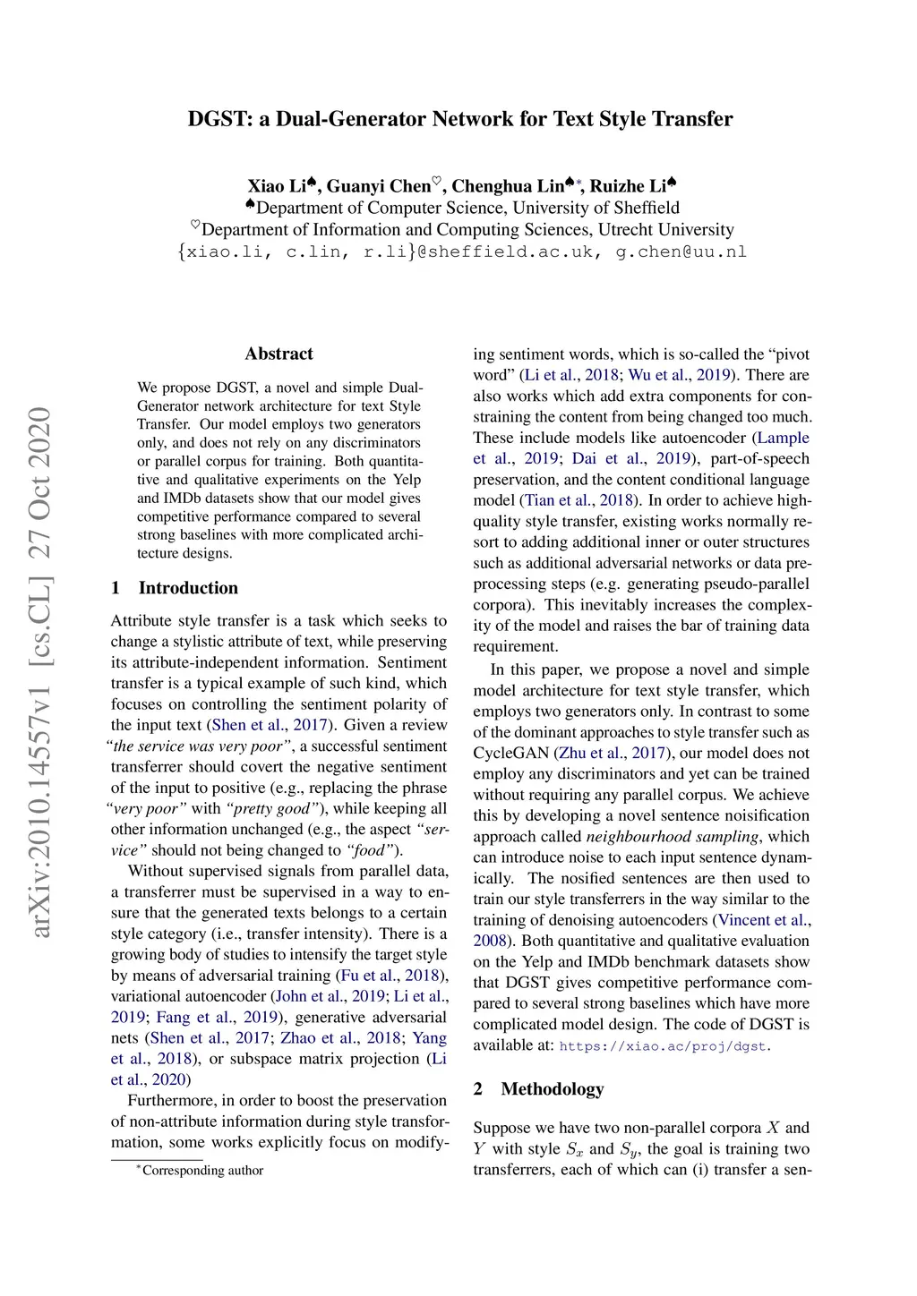 DGST: a Dual-Generator Network for Text Style Transfer