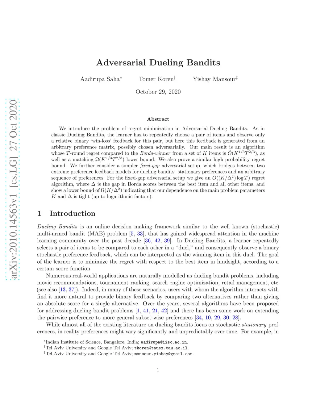 Adversarial Dueling Bandits