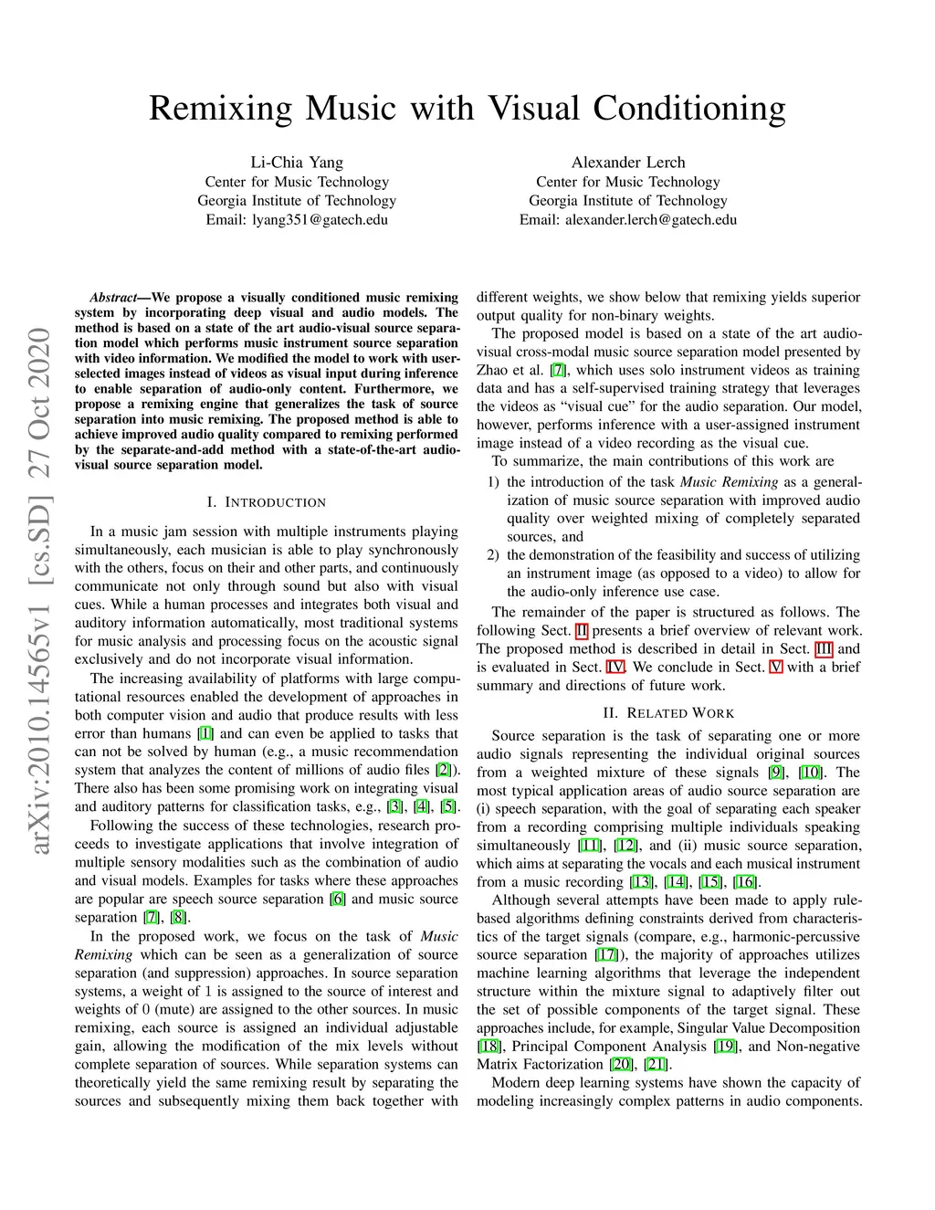 We propose a visually conditioned music remixing system by incorporating deep visual and audio models. The method is based on a state of the art audio-visual source separation model which performs music instrument source separation with video information. We modified the model to work with user-selected images instead of videos as visual input during inference to enable separation of audio-only content. Furthermore, we propose a remixing engine that generalizes the task of source separation into music remixing. The proposed method is able to achieve improved audio quality compared to remixing performed by the separate-and-add method with a state-of-the-art audio-visual source separation model.
