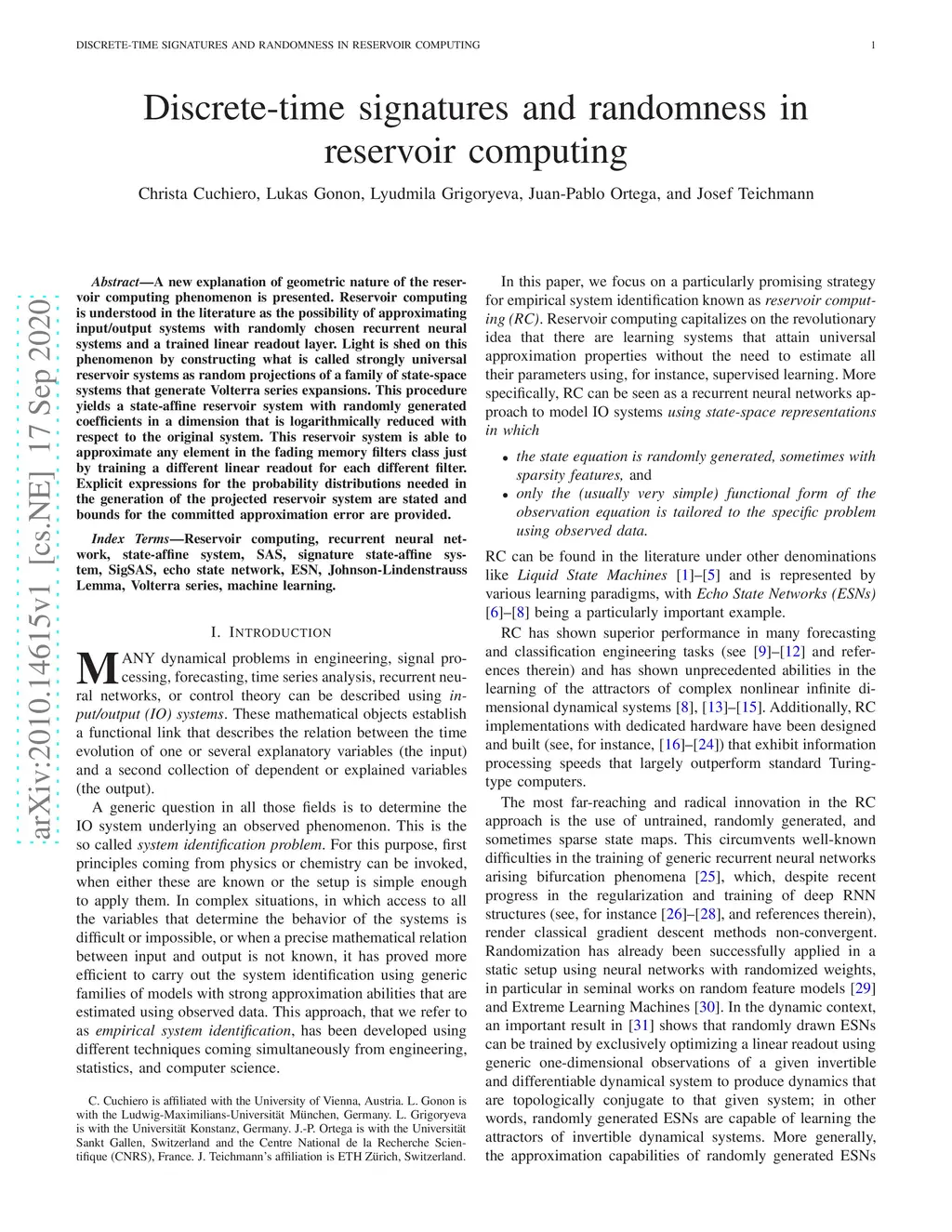 A new explanation of geometric nature of the reservoir computing phenomenon is presented. Reservoir computing is understood in the literature as the possibility of approximating input/output systems with randomly chosen recurrent neural systems and a trained linear readout layer. Light is shed on this phenomenon by constructing what is called strongly universal reservoir systems as random projections of a family of state-space systems that generate Volterra series expansions. This procedure yields a state-affine reservoir system with randomly generated coefficients in a dimension that is logarithmically reduced with respect to the original system. This reservoir system is able to approximate any element in the fading memory filters class just by training a different linear readout for each different filter. Explicit expressions for the probability distributions needed in the generation of the projected reservoir system are stated and bounds for the committed approximation error are provided.