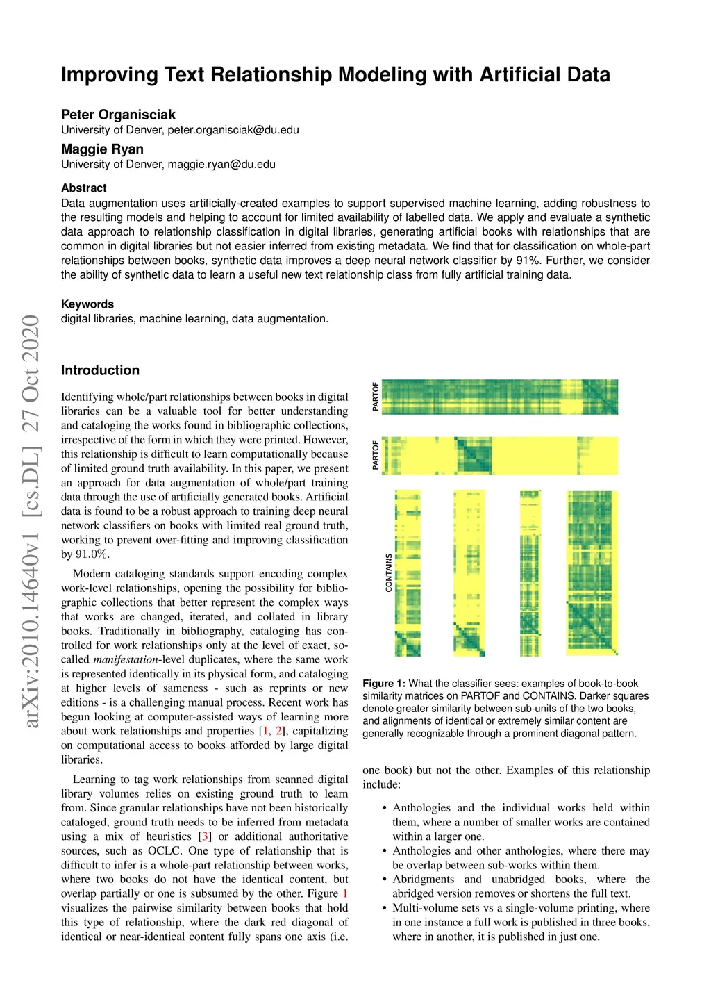 Data augmentation uses artificially-created examples to support supervised machine learning, adding robustness to the resulting models and helping to account for limited availability of labelled data. We apply and evaluate a synthetic data approach to relationship classification in digital libraries, generating artificial books with relationships that are common in digital libraries but not easier inferred from existing metadata. We find that for classification on whole-part relationships between books, synthetic data improves a deep neural network classifier by 91%. Further, we consider the ability of synthetic data to learn a useful new text relationship class from fully artificial training data.