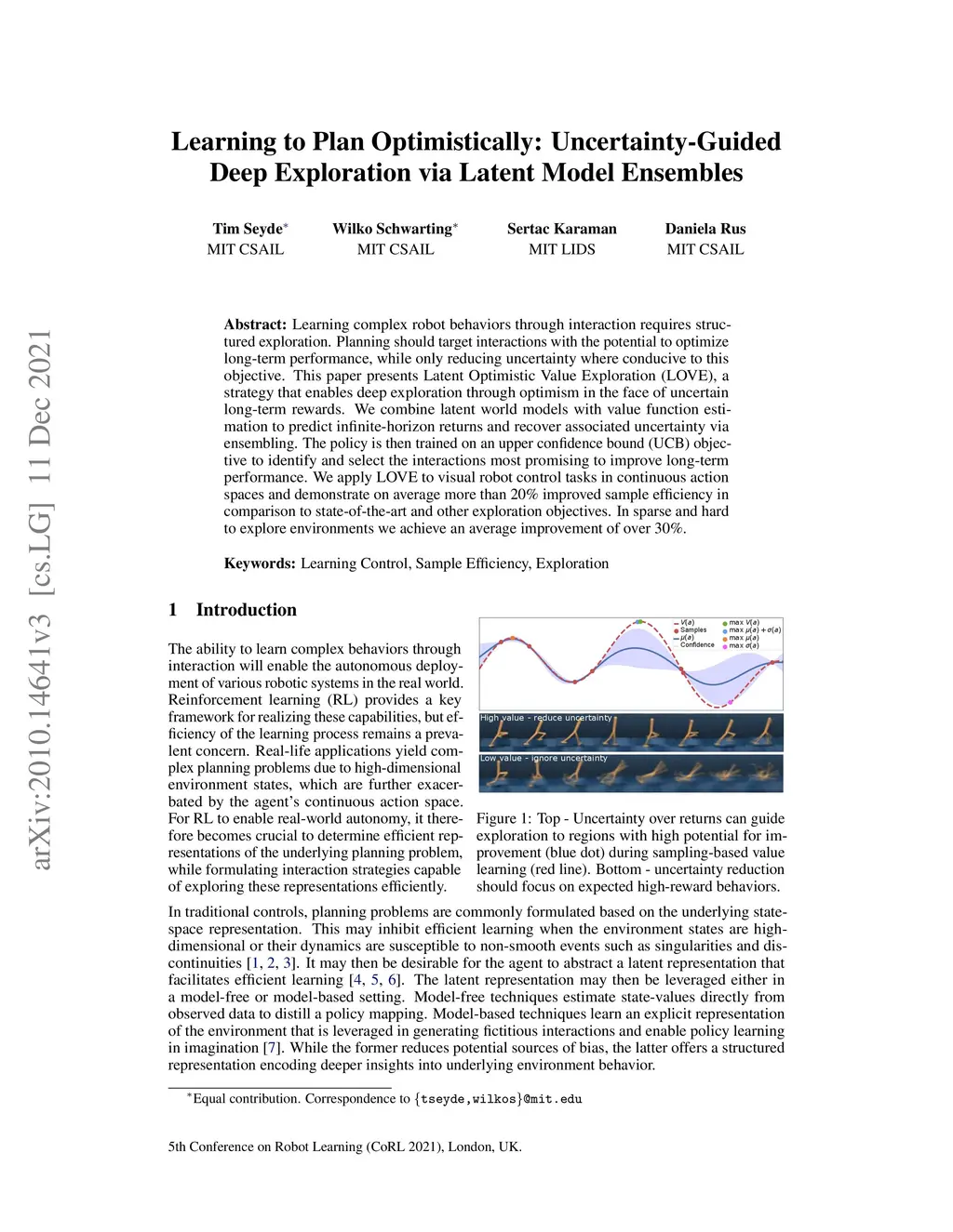 Learning complex robot behaviors through interaction requires structured exploration. Planning should target interactions with the potential to optimize long-term performance, while only reducing uncertainty where conducive to this objective. This paper presents Latent Optimistic Value Exploration (LOVE), a strategy that enables deep exploration through optimism in the face of uncertain long-term rewards. We combine latent world models with value function estimation to predict infinite-horizon returns and recover associated uncertainty via ensembling. The policy is then trained on an upper confidence bound (UCB) objective to identify and select the interactions most promising to improve long-term performance. We apply LOVE to visual robot control tasks in continuous action spaces and demonstrate on average more than 20% improved sample efficiency in comparison to state-of-the-art and other exploration objectives. In sparse and hard to explore environments we achieve an average improvement of over 30%.