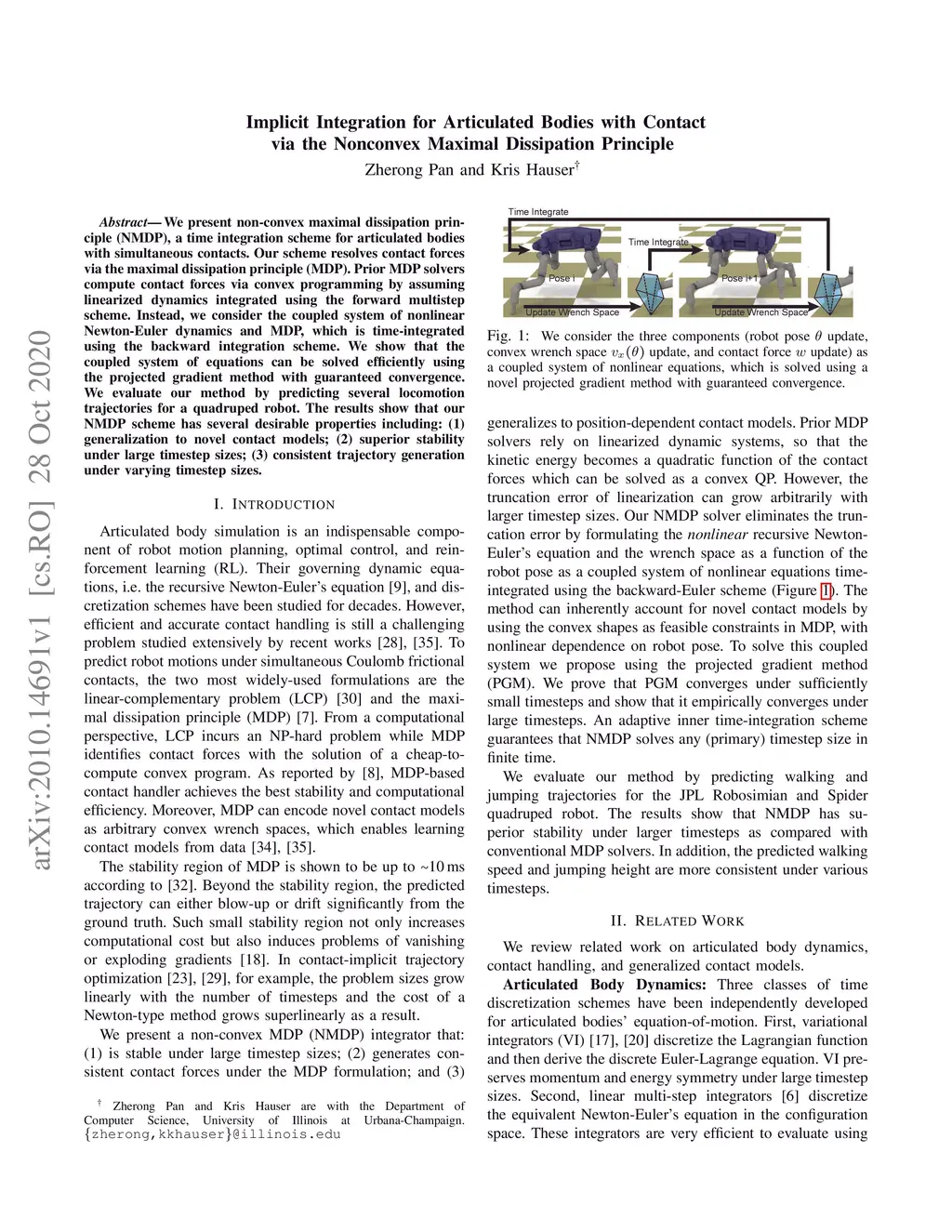 We present non-convex maximal dissipation principle (NMDP), a time integration scheme for articulated bodies with simultaneous contacts. Our scheme resolves contact forces via the maximal dissipation principle (MDP). Prior MDP solvers compute contact forces via convex programming by assuming linearized dynamics integrated using the forward multistep scheme. Instead, we consider the coupled system of nonlinear Newton-Euler dynamics and MDP, which is time-integrated using the backward integration scheme. We show that the coupled system of equations can be solved efficiently using the projected gradient method with guaranteed convergence. We evaluate our method by predicting several locomotion trajectories for a quadruped robot. The results show that our NMDP scheme has several desirable properties including: (1) generalization to novel contact models; (2) superior stability under large timestep sizes; (3) consistent trajectory generation under varying timestep sizes.