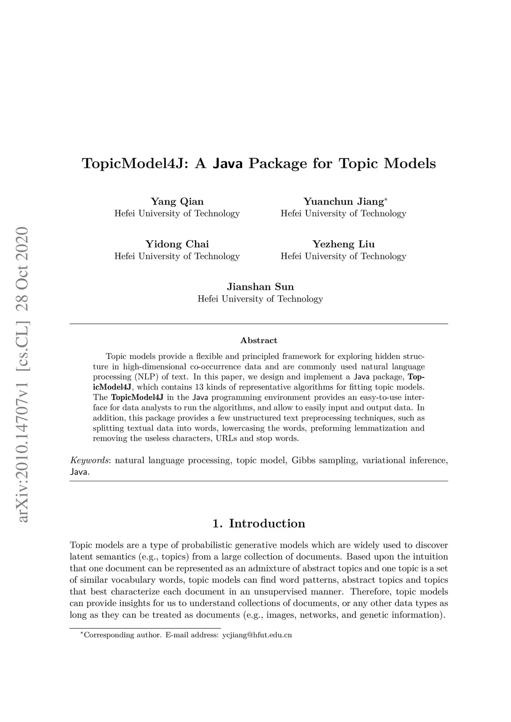 Topic models provide a flexible and principled framework for exploring hidden structure in high-dimensional co-occurrence data and are commonly used natural language processing (NLP) of text. In this paper, we design and implement a Java package, TopicModel4J, which contains 13 kinds of representative algorithms for fitting topic models. The TopicModel4J in the Java programming environment provides an easy-to-use interface for data analysts to run the algorithms, and allow to easily input and output data. In addition, this package provides a few unstructured text preprocessing techniques, such as splitting textual data into words, lowercasing the words, preforming lemmatization and removing the useless characters, URLs and stop words.