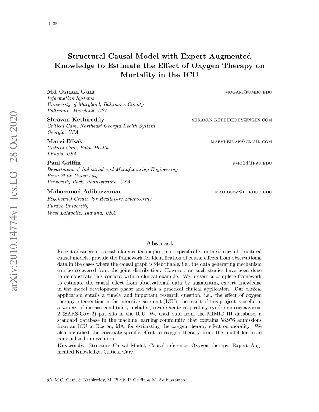 Recent advances in causal inference techniques, more specifically, in the theory of structural causal models, provide the framework for identification of causal effects from observational data in the cases where the causal graph is identifiable, i.e., the data generating mechanism can be recovered from the joint distribution. However, no such studies have been done to demonstrate this concept with a clinical example. We present a complete framework to estimate the causal effect from observational data by augmenting expert knowledge in the model development phase and with a practical clinical application. Our clinical application entails a timely and important research question, i.e., the effect of oxygen therapy intervention in the intensive care unit (ICU); the result of this project is useful in a variety of disease conditions, including severe acute respiratory syndrome coronavirus-2 (SARS-CoV-2) patients in the ICU. We used data from the MIMIC III database, a standard database in the machine learning community that contains 58,976 admissions from an ICU in Boston, MA, for estimating the oxygen therapy effect on morality. We also identified the covariate-specific effect to oxygen therapy from the model for more personalized intervention.