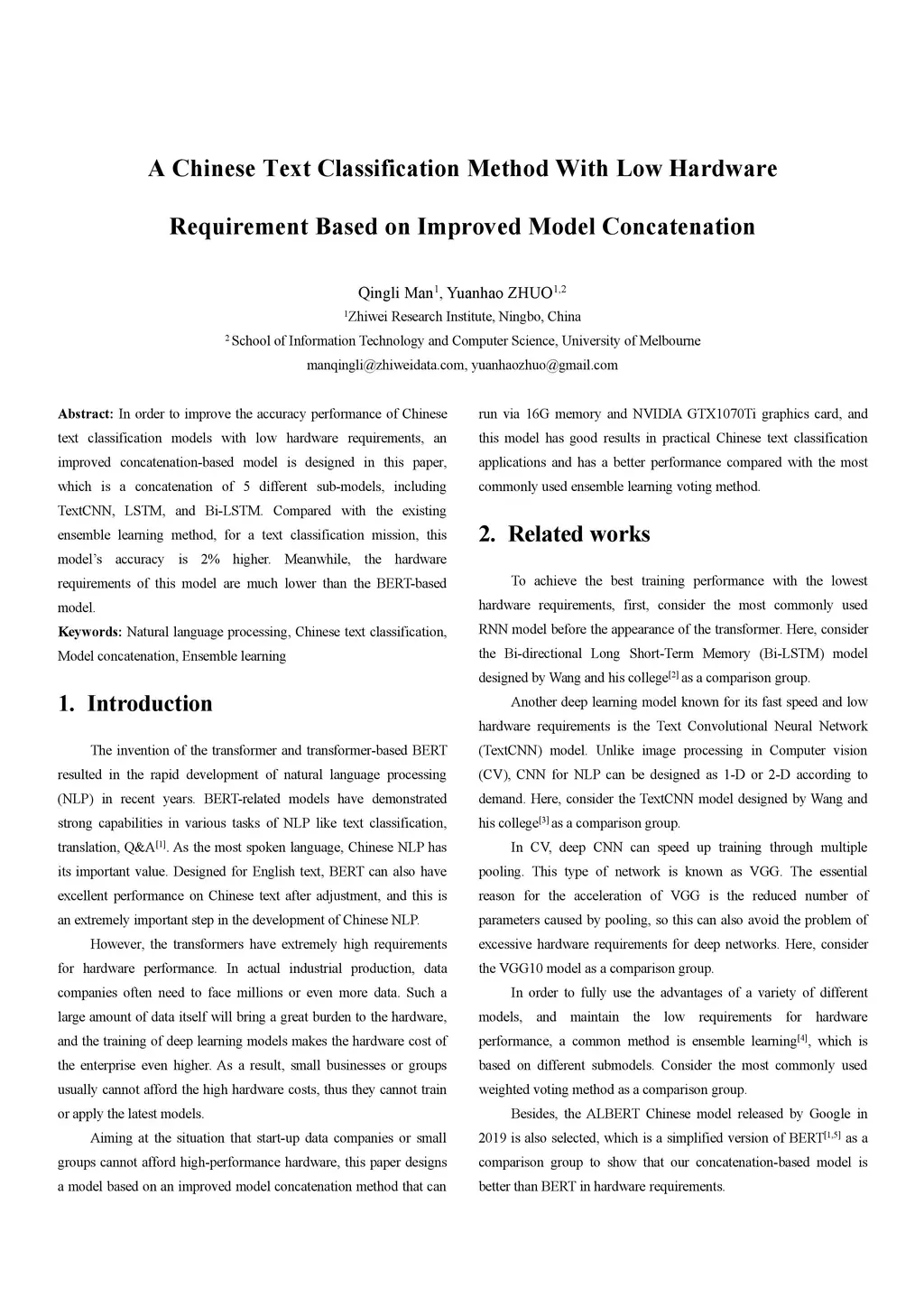 In order to improve the accuracy performance of Chinese text classification models with low hardware requirements, an improved concatenation-based model is designed in this paper, which is a concatenation of 5 different sub-models, including TextCNN, LSTM, and Bi-LSTM. Compared with the existing ensemble learning method, for a text classification mission, this model's accuracy is 2% higher. Meanwhile, the hardware requirements of this model are much lower than the BERT-based model.