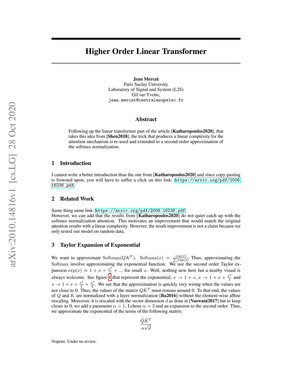 Following up on the linear transformer part of the article from Katharopoulos et al., that takes this idea from Shen et al., the trick that produces a linear complexity for the attention mechanism is re-used and extended to a second-order approximation of the softmax normalization.