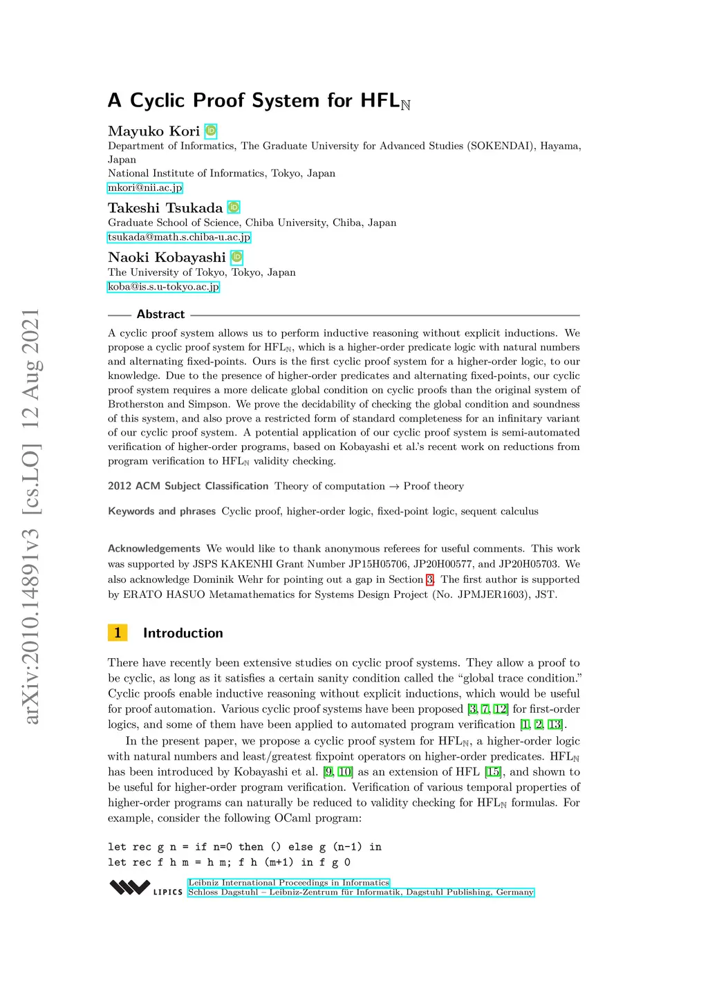 A cyclic proof system allows us to perform inductive reasoning without explicit inductions. We propose a cyclic proof system for HFLN, which is a higher-order predicate logic with natural numbers and alternating fixed-points. Ours is the first cyclic proof system for a higher-order logic, to our knowledge. Due to the presence of higher-order predicates and alternating fixed-points, our cyclic proof system requires a more delicate global condition on cyclic proofs than the original system of Brotherston and Simpson. We prove the decidability of checking the global condition and soundness of this system, and also prove a restricted form of standard completeness for an infinitary variant of our cyclic proof system. A potential application of our cyclic proof system is semi-automated verification of higher-order programs, based on Kobayashi et al.'s recent work on reductions from program verification to HFLN validity checking.