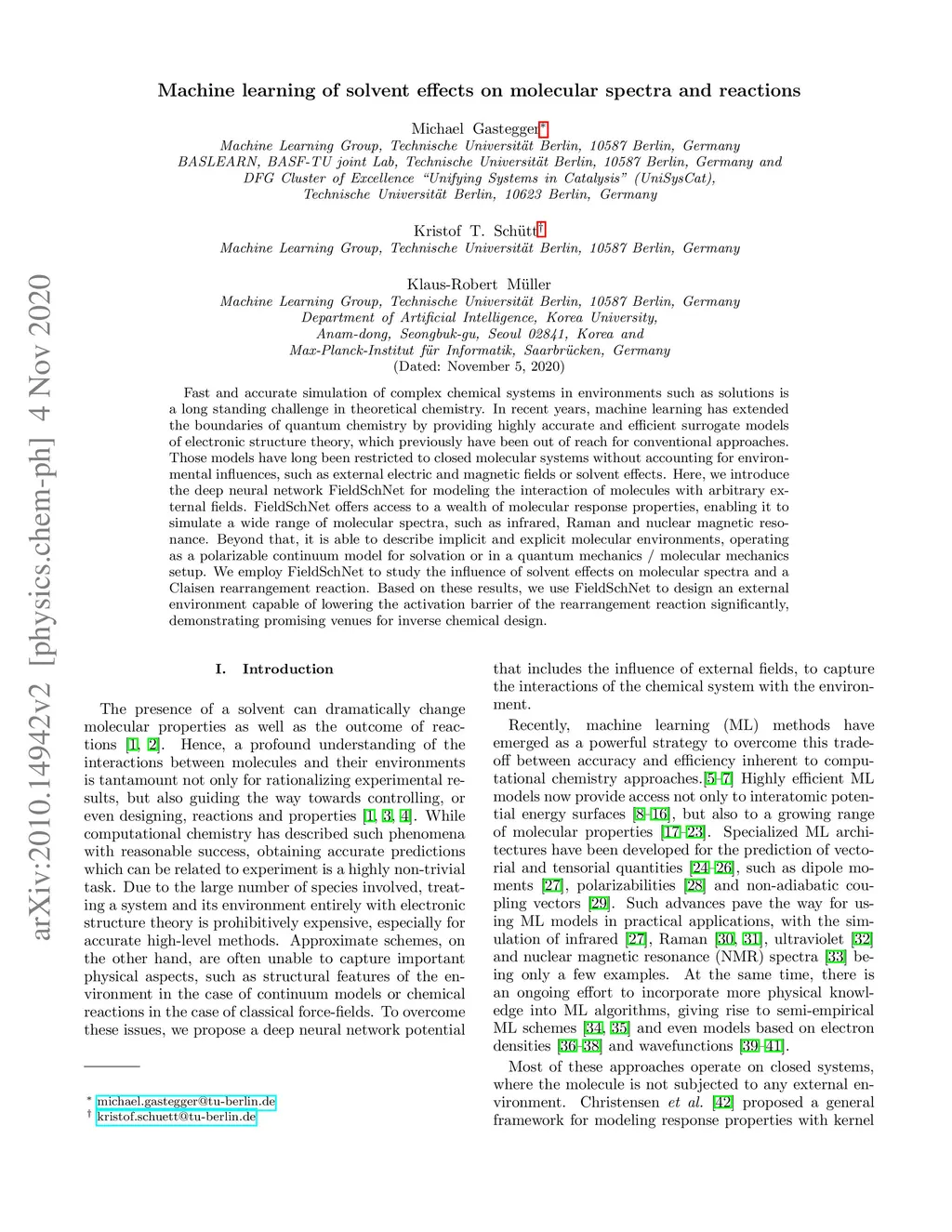 Fast and accurate simulation of complex chemical systems in environments such as solutions is a long standing challenge in theoretical chemistry. In recent years, machine learning has extended the boundaries of quantum chemistry by providing highly accurate and efficient surrogate models of electronic structure theory, which previously have been out of reach for conventional approaches. Those models have long been restricted to closed molecular systems without accounting for environmental influences, such as external electric and magnetic fields or solvent effects. Here, we introduce the deep neural network FieldSchNet for modeling the interaction of molecules with arbitrary external fields. FieldSchNet offers access to a wealth of molecular response properties, enabling it to simulate a wide range of molecular spectra, such as infrared, Raman and nuclear magnetic resonance. Beyond that, it is able to describe implicit and explicit molecular environments, operating as a polarizable continuum model for solvation or in a quantum mechanics / molecular mechanics setup. We employ FieldSchNet to study the influence of solvent effects on molecular spectra and a Claisen rearrangement reaction. Based on these results, we use FieldSchNet to design an external environment capable of lowering the activation barrier of the rearrangement reaction significantly, demonstrating promising venues for inverse chemical design.