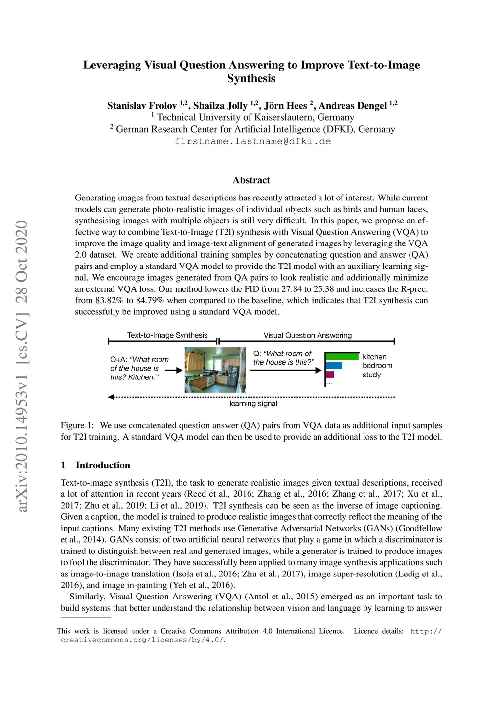Generating images from textual descriptions has recently attracted a lot of interest. While current models can generate photo-realistic images of individual objects such as birds and human faces, synthesising images with multiple objects is still very difficult. In this paper, we propose an effective way to combine Text-to-Image (T2I) synthesis with Visual Question Answering (VQA) to improve the image quality and image-text alignment of generated images by leveraging the VQA 2.0 dataset. We create additional training samples by concatenating question and answer (QA) pairs and employ a standard VQA model to provide the T2I model with an auxiliary learning signal. We encourage images generated from QA pairs to look realistic and additionally minimize an external VQA loss. Our method lowers the FID from 27.84 to 25.38 and increases the R-prec. from 83.82% to 84.79% when compared to the baseline, which indicates that T2I synthesis can successfully be improved using a standard VQA model.